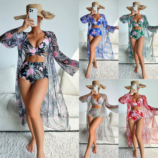 Women's Elegant Lady Printing Flower 3 Pieces Set Bikinis Swimwear