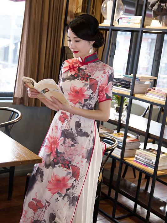 Lacy Ink&Lotus Print Long Cheongsam Dress