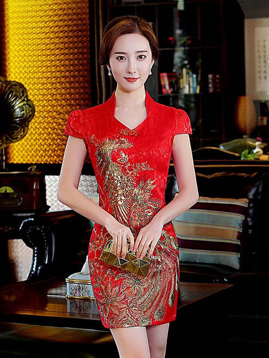 National Flower Printed Brilliant Yellow Short Slim Cheongsam Dress