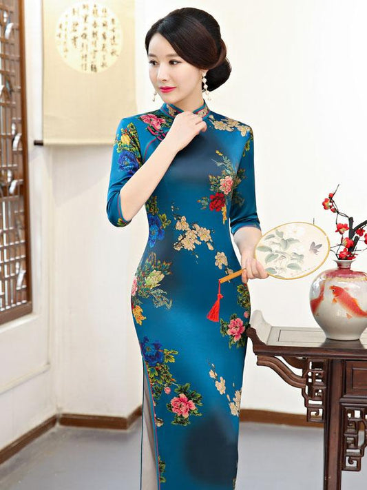 Vintage Blue Floral Stand-collar Ao Dai Long Cheongsam