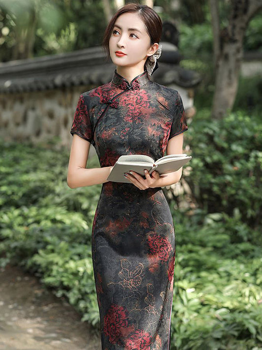 Vintage Split-Side Stand Collar Floral Printed Short Sleeves Long Cheongsams