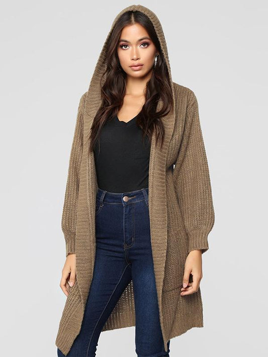 Casual Loose Solid Color Zipper Drawstring Long Sleeves Hooded Trench Coat