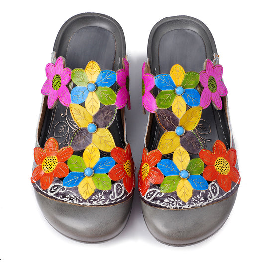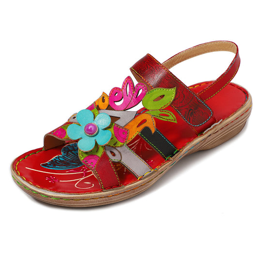 Leather Handmade Flower Retro Flat-soled Casual Sandals