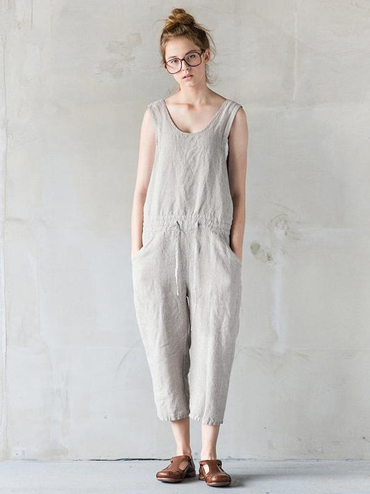 Loose Sleeveless Solid Color Split-Joint Tied Waist Round-Neck Jumpsuits