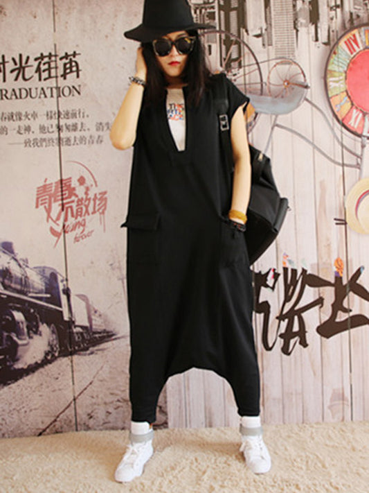 Cape Loose Pockets Solid Color Round-Neck Jumpsuits