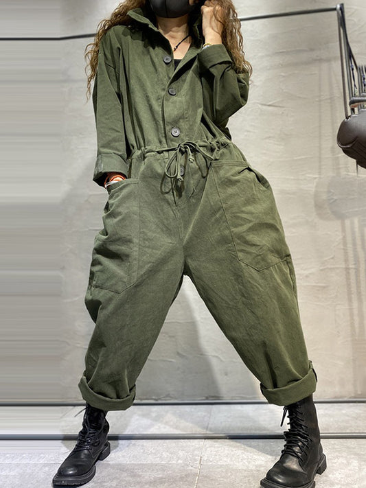 Women Summer Casual Solid Drawstring Pocket Cotton Jumpsuits