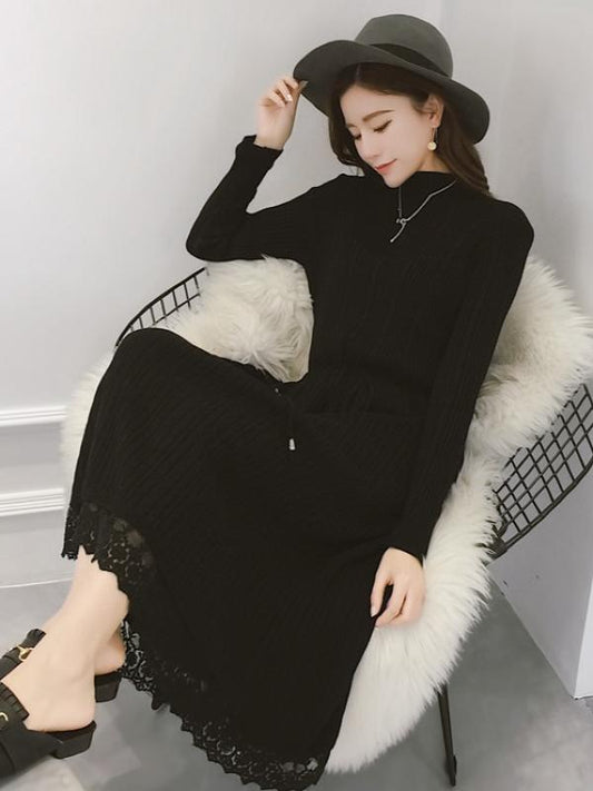 Lace Split-joint Drawstring Base Knitting Midi Dress