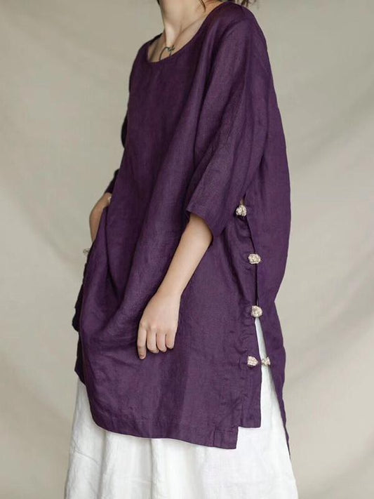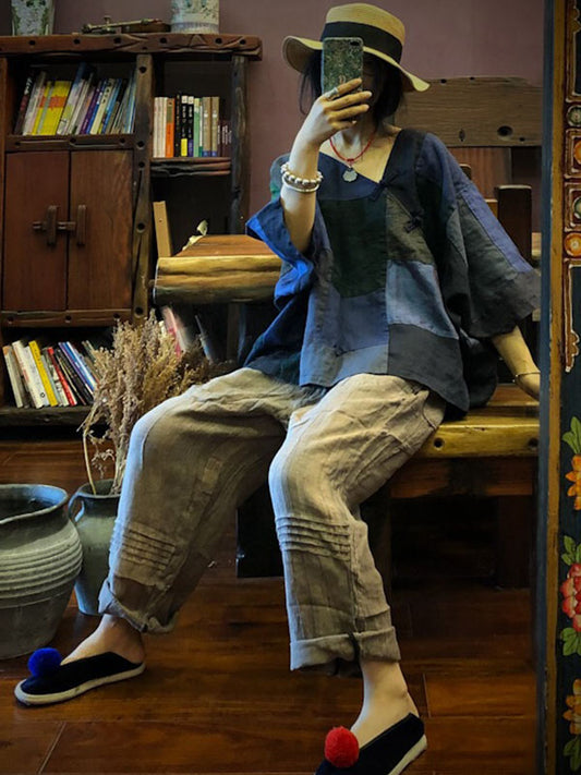 Women Vintage Patch Spliced Frog Pocket Summer Loose Shirt