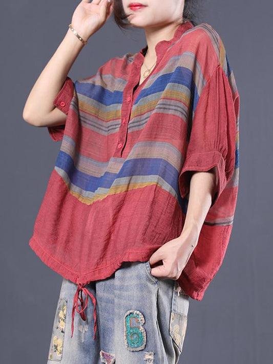 Women Vintage Flower V-neck Drawstring Ramie Shirt