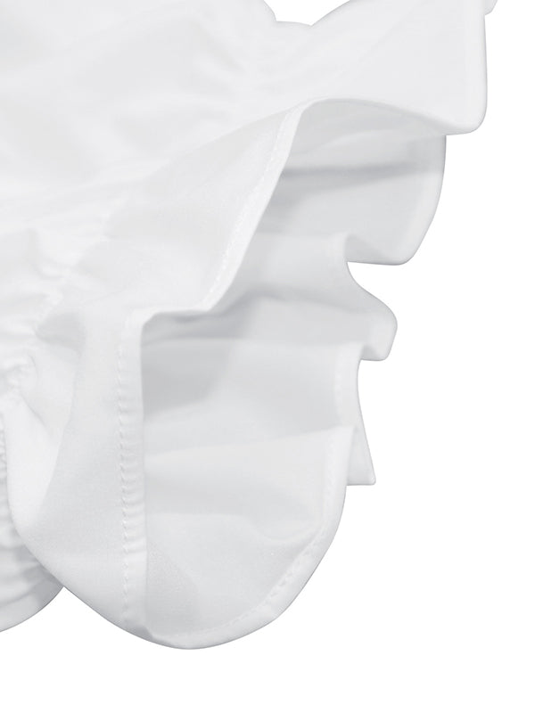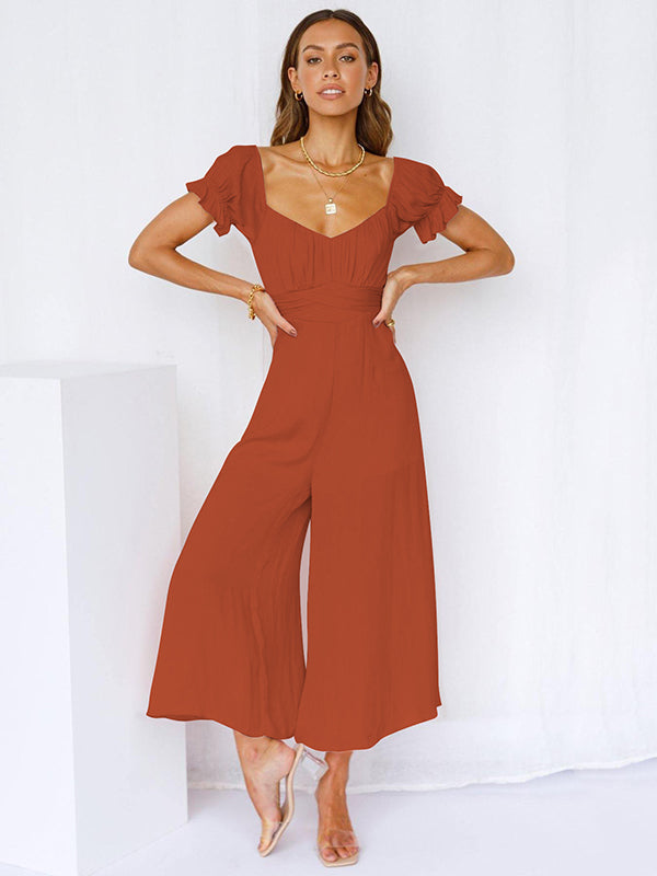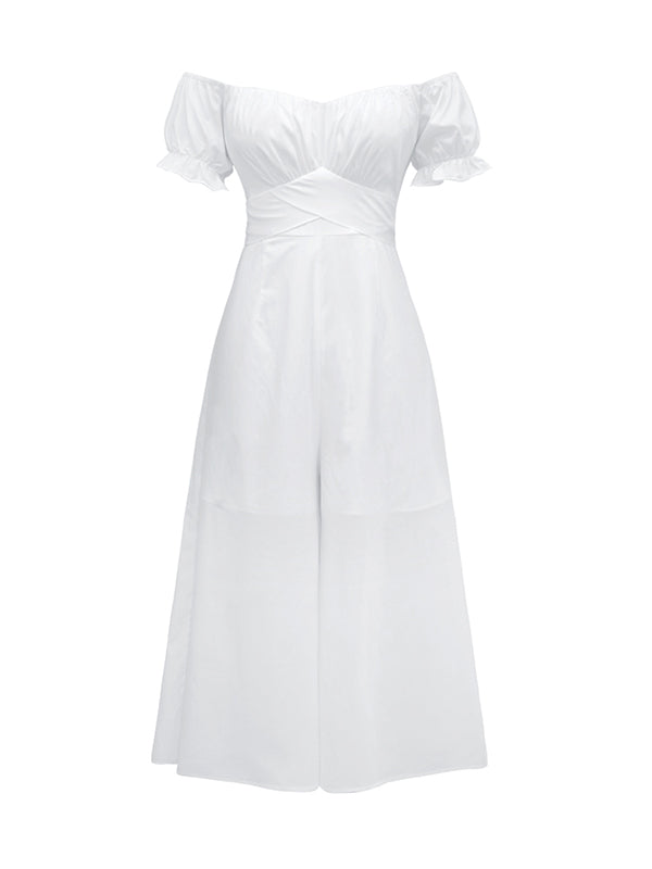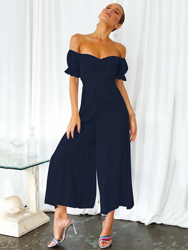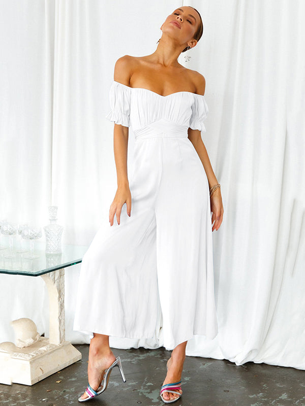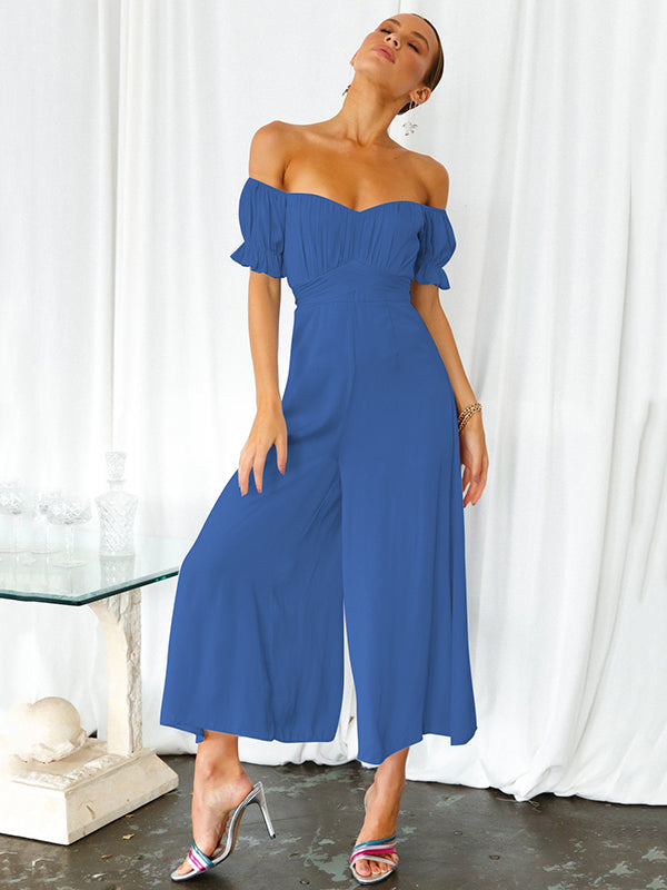 13 Colors Puff Sleeves Solid Color Cold Shoulder Wide Leg Jumpsuits