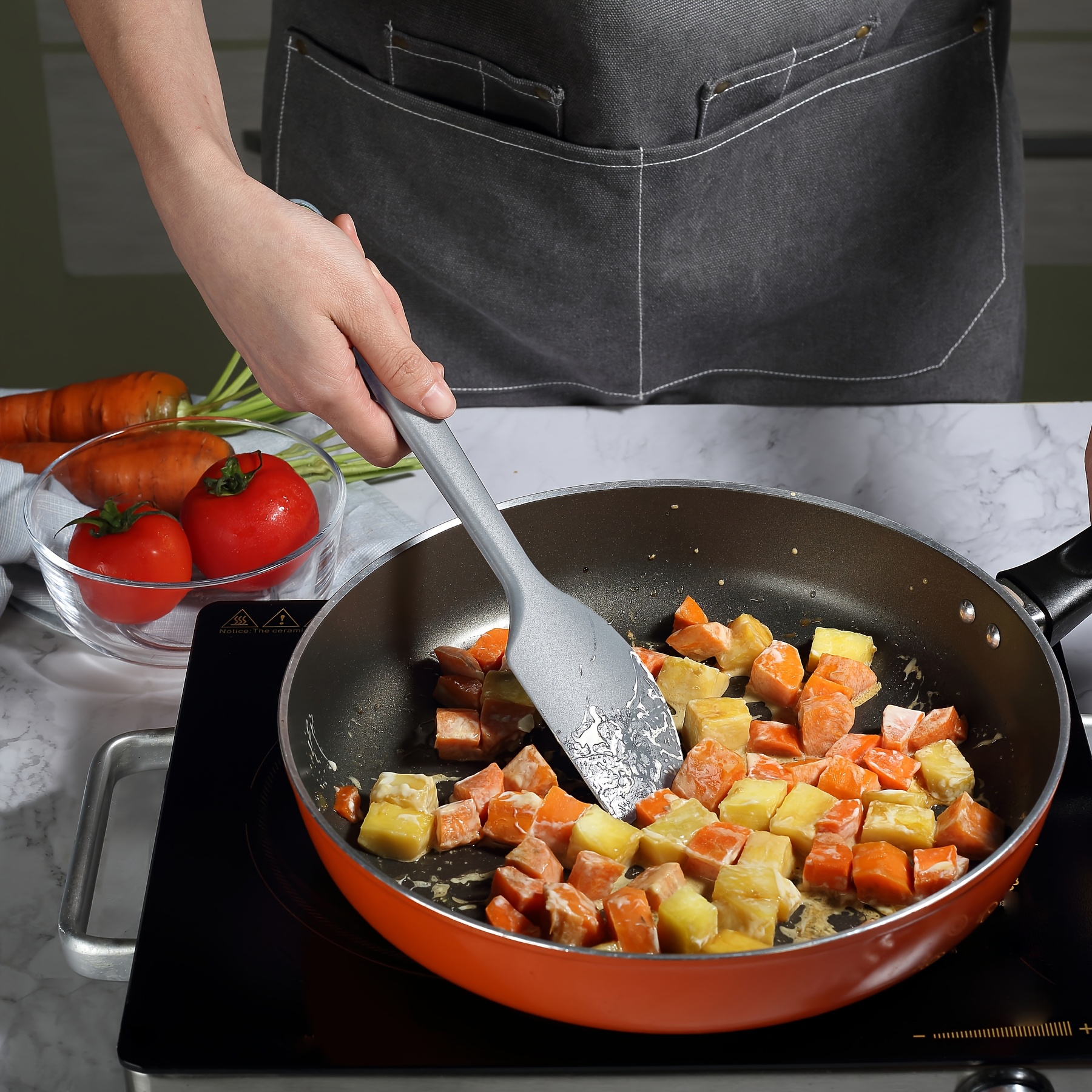 Regarding this product: 1. Made from food-safe silicone, ensuring your cooking remains safe and healthy. The rubber spatula features a durable stainless steel core. 2. Its seamless one-piece design enhances sturdiness and simplifies cleaning. The angled head and uniquely colored handles are gentle on non-stick cookware and remain cool to the touch, making storage convenient.