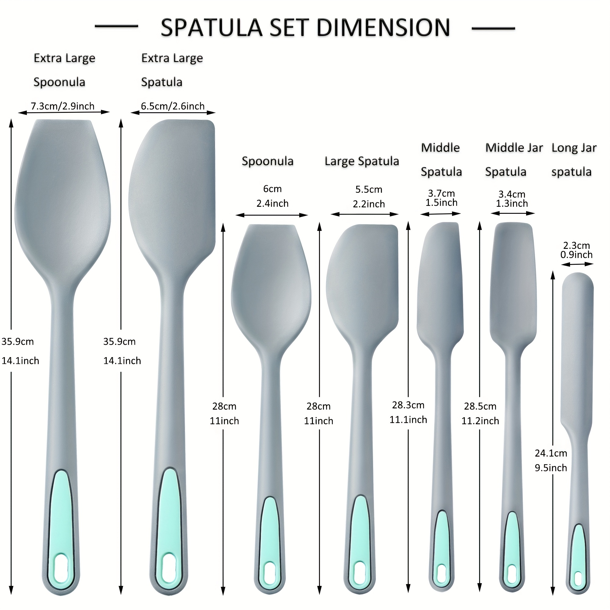3. Heat-resistant cooking spatula - withstands temperatures up to 446°F, safe for dishwashers, and will not melt while cooking. We utilize high-quality materials that are safe and gentle on all your cookware. 4. 7-piece spatula set - includes 1 extra-large spatula, 1 extra-large spoonula, 1 long jar spatula, 1 medium jar spatula, 1 large spatula, 1 medium spatula, and 1 spoonula, offering various sizes to cater to different requirements.