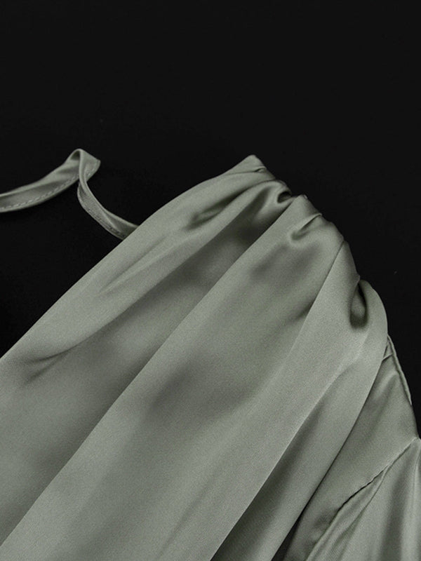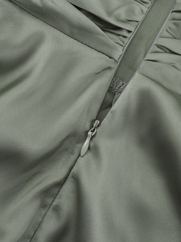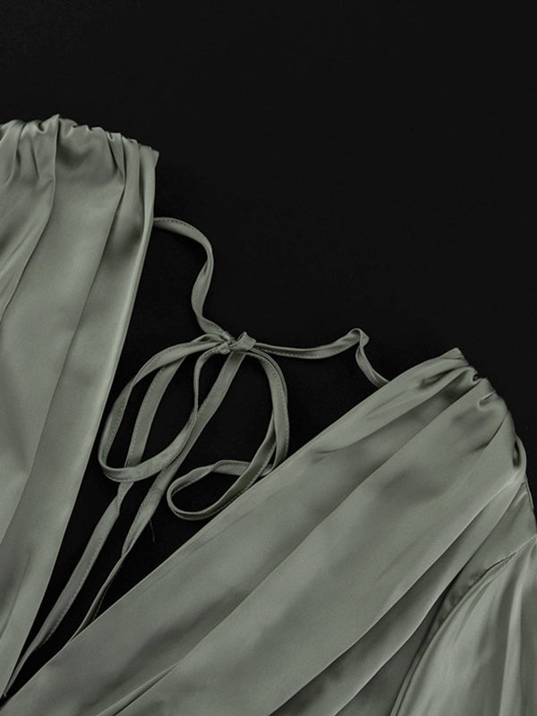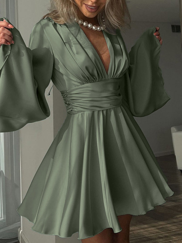 A-Line Flared Sleeves Backless Solid Color Tied Triple Layered Zipper Deep V-Neck Mini Dresses