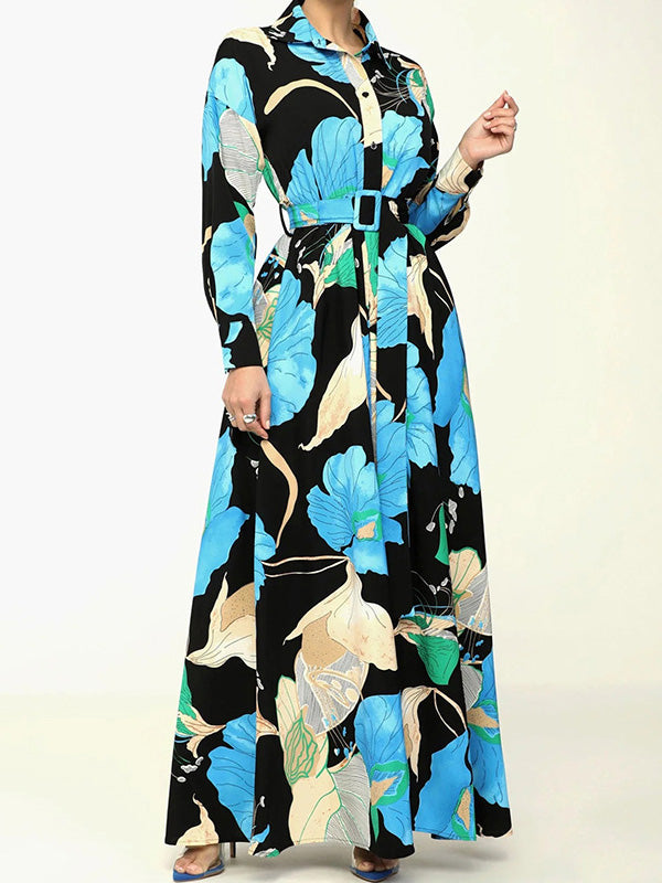 A-Line High Waisted Belted Buttoned Flower Print Lapel Maxi Dresses