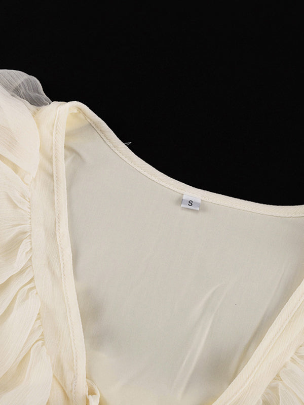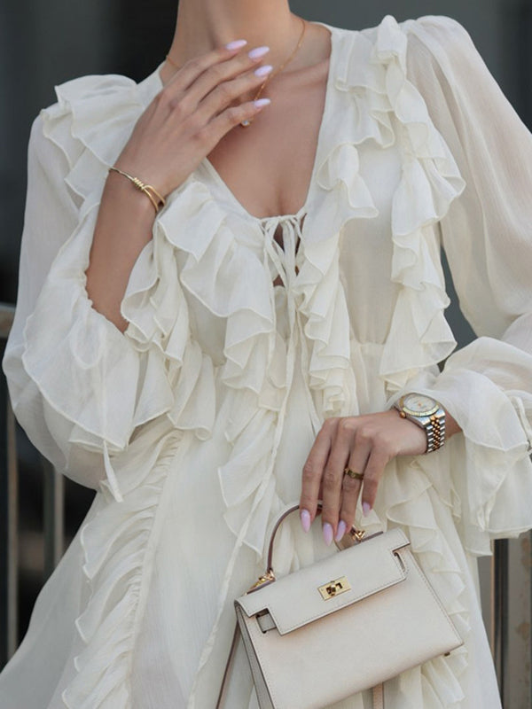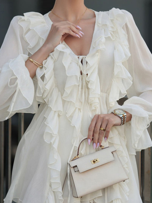 A-Line High Waisted Ruffle Trim Solid Color Tied V-Neck Mini Dresses