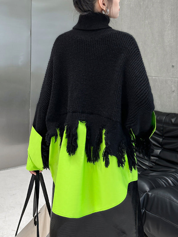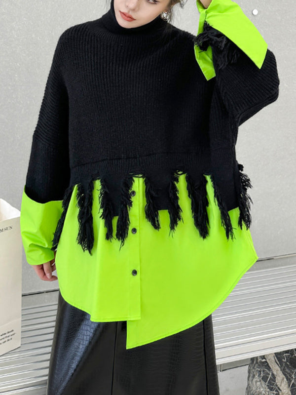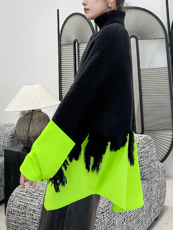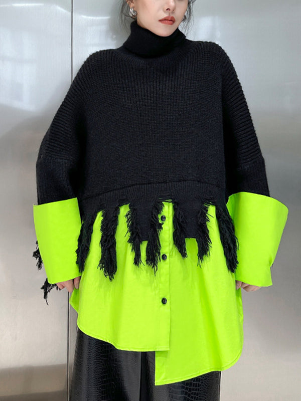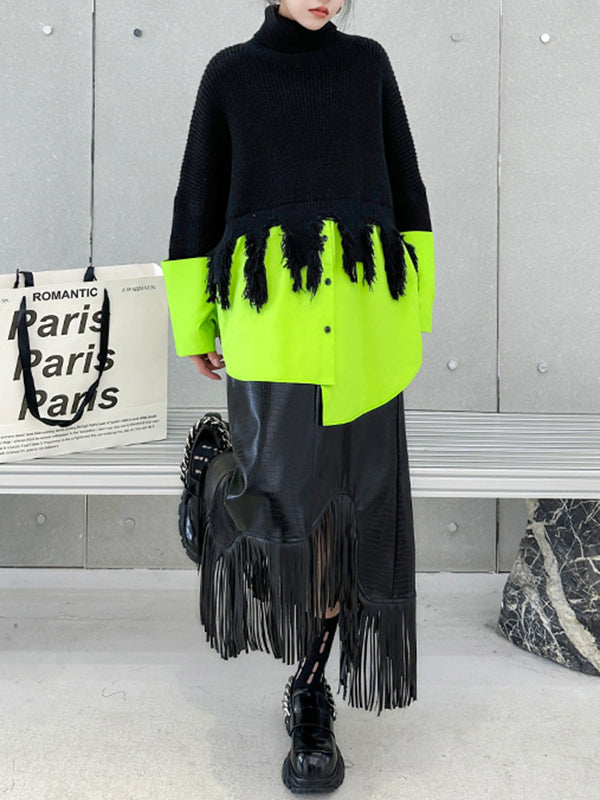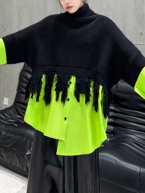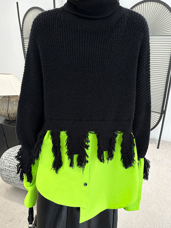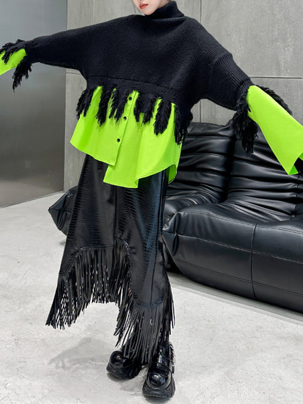 A-Line Long Sleeves Asymmetric Fringed Split-Joint High Neck Knitwear Pullovers Sweater Tops