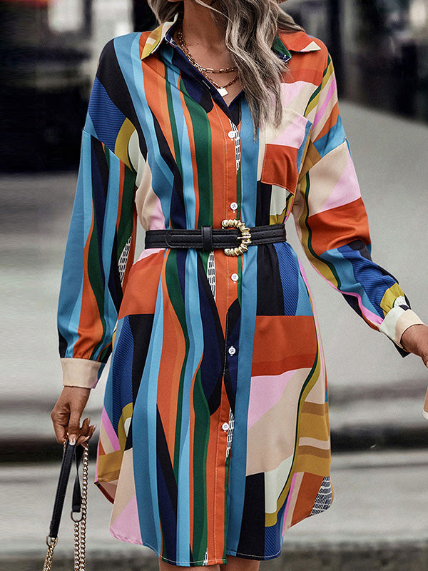 A-Line Long Sleeves Buttoned Contrast Color Lapel Midi Dresses Shirt Dress