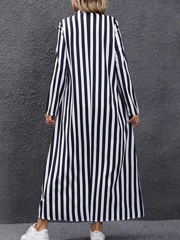 A-Line Long Sleeves Contrast Color Pleated Striped V-Neck Maxi Dresses