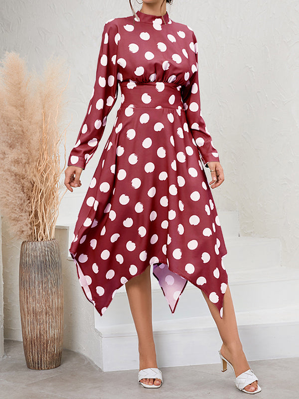 A-Line Long Sleeves Elasticity Hollow Polka-Dot Mock Neck Midi Dresses