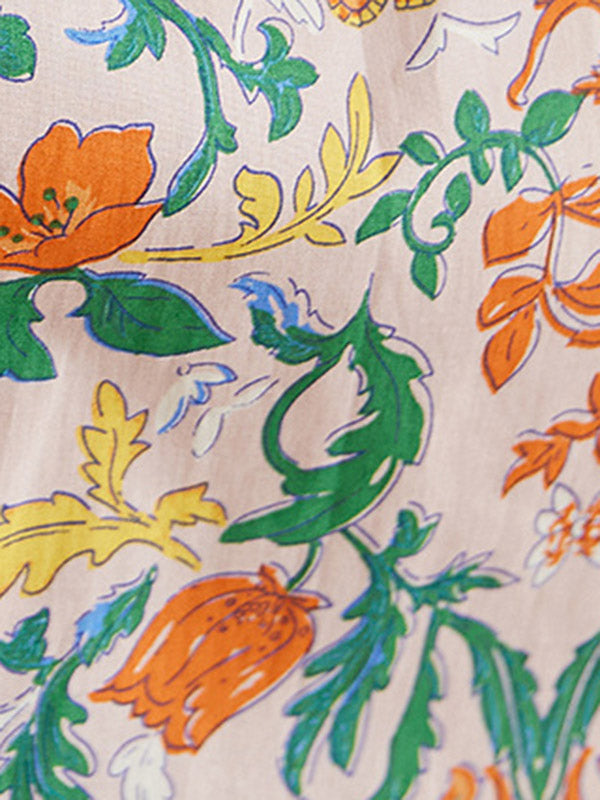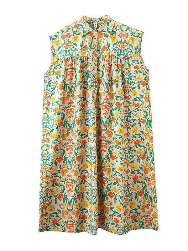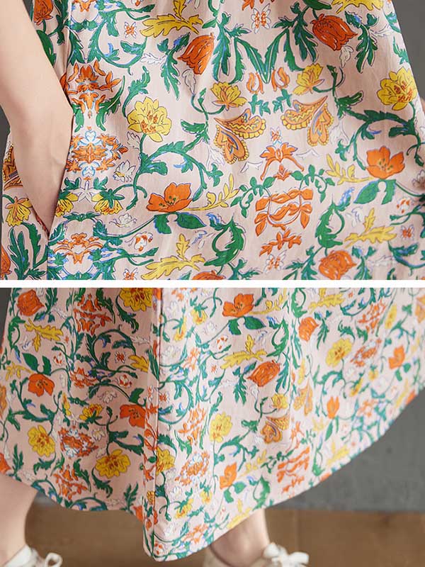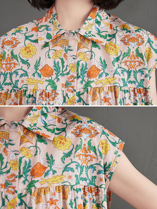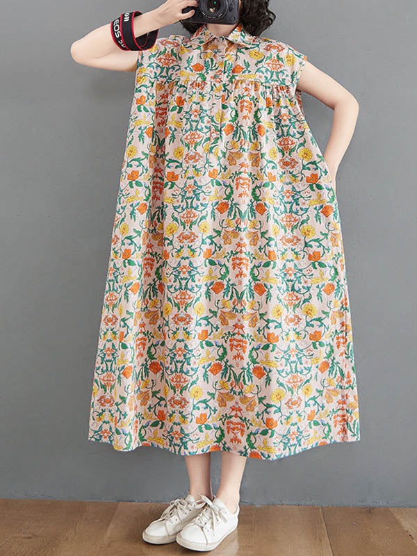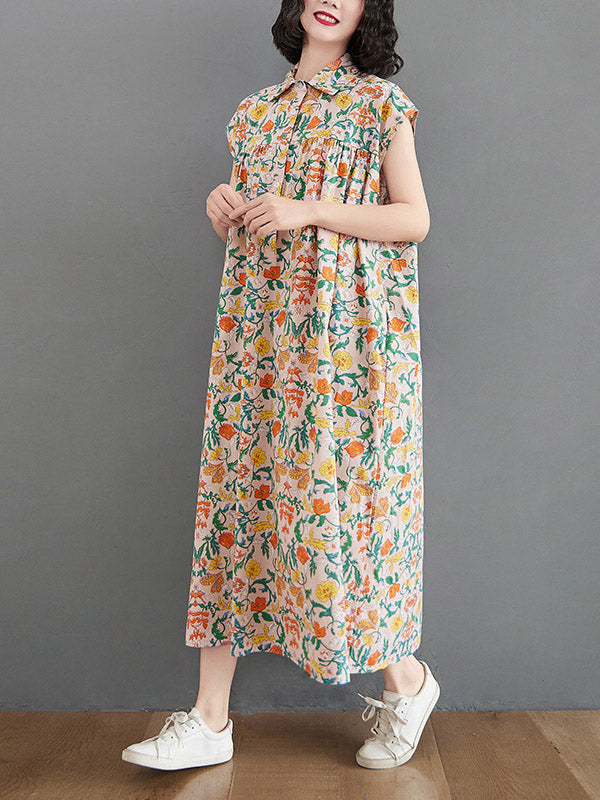 Artistic Retro Floral Printed Pleated Buttoned Lapel Collar Short Sleeves Midi Dress