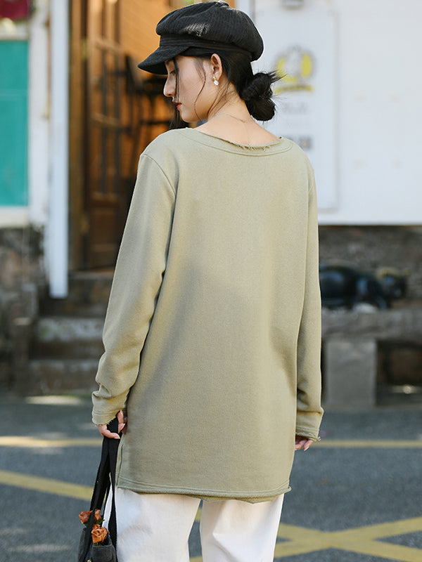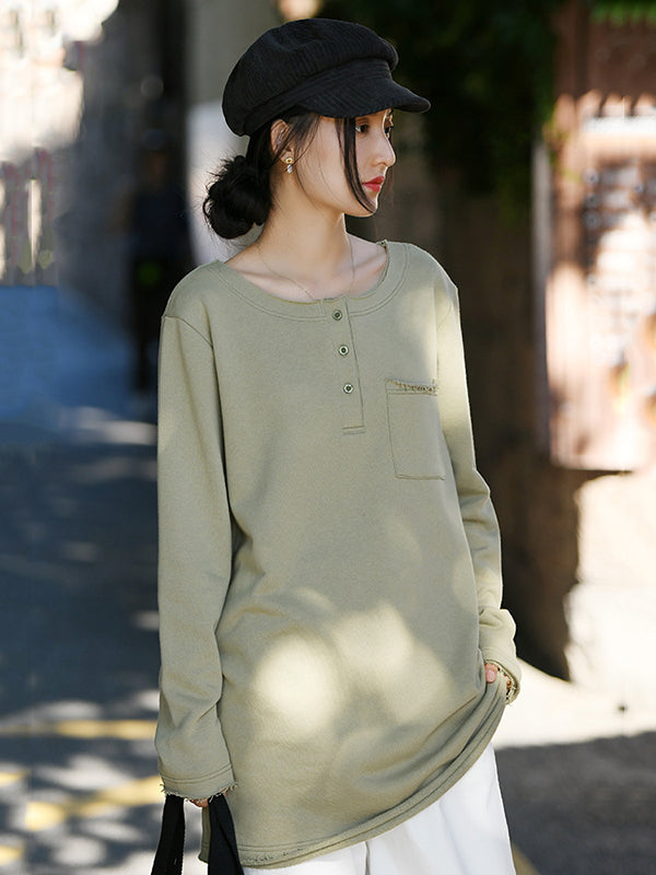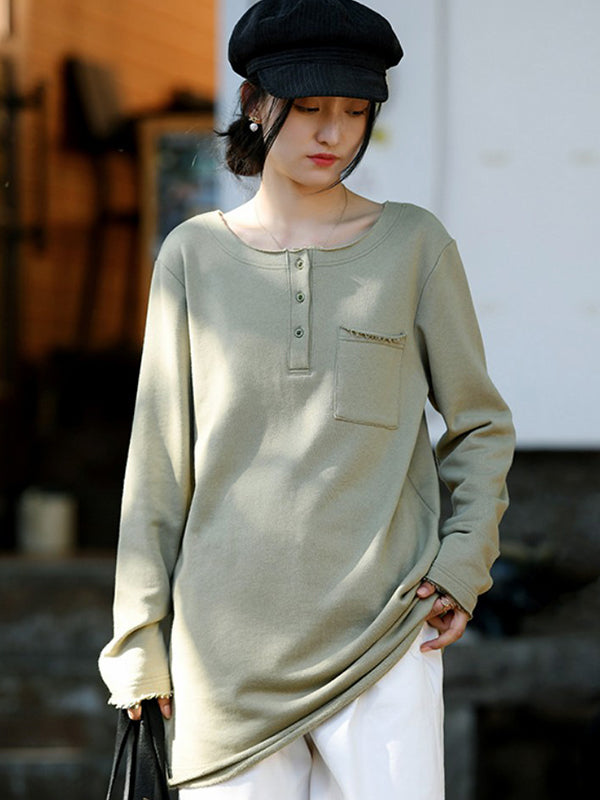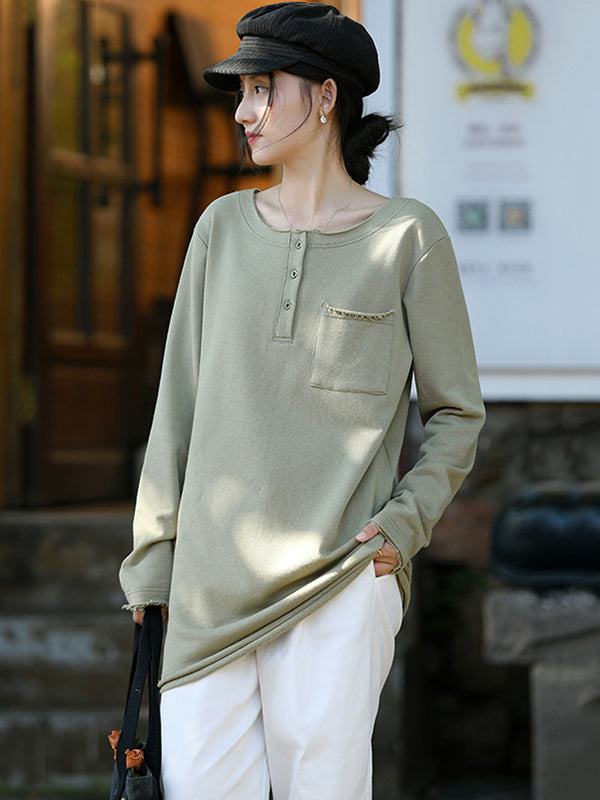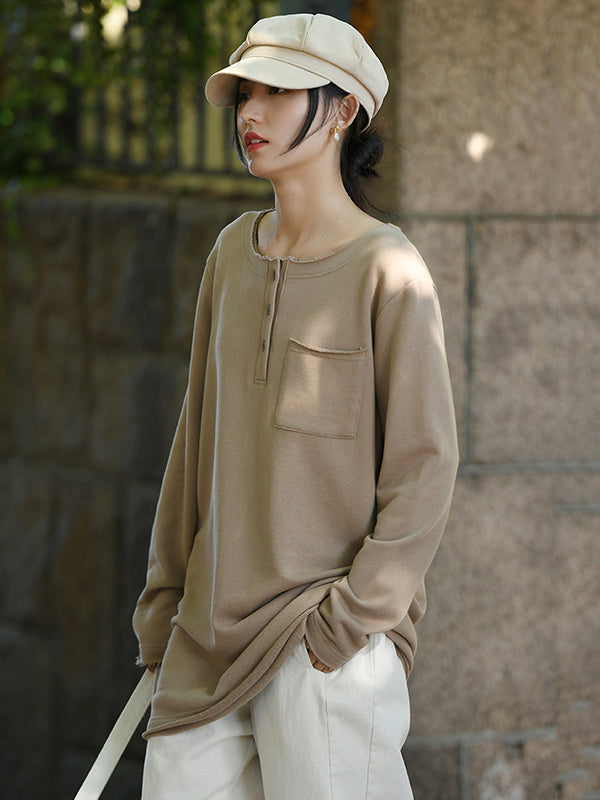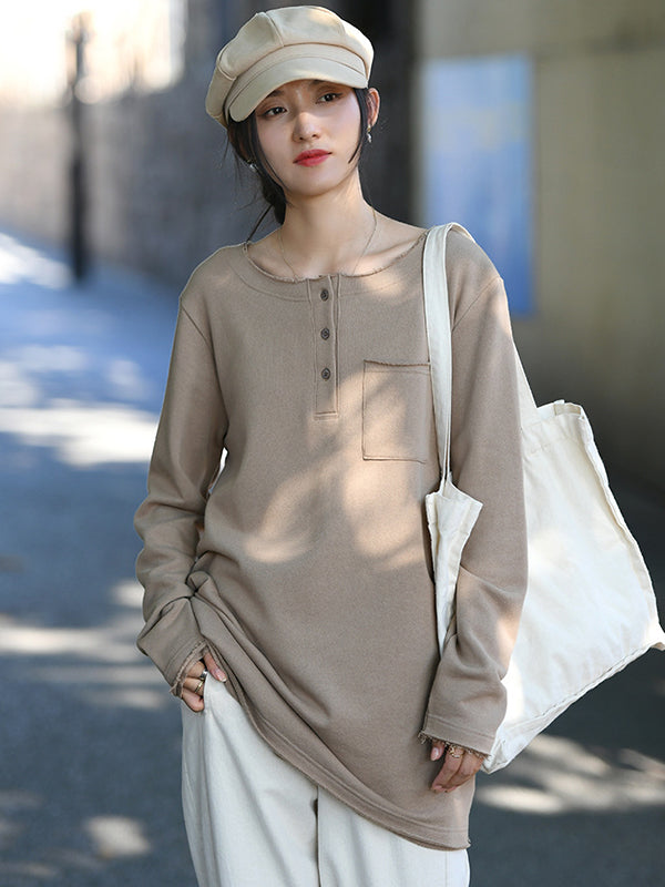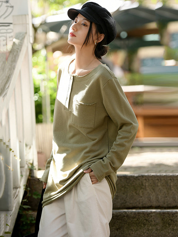 Artistic Retro Long Sleeves Loose Solid Color Round-Neck T-Shirts Tops