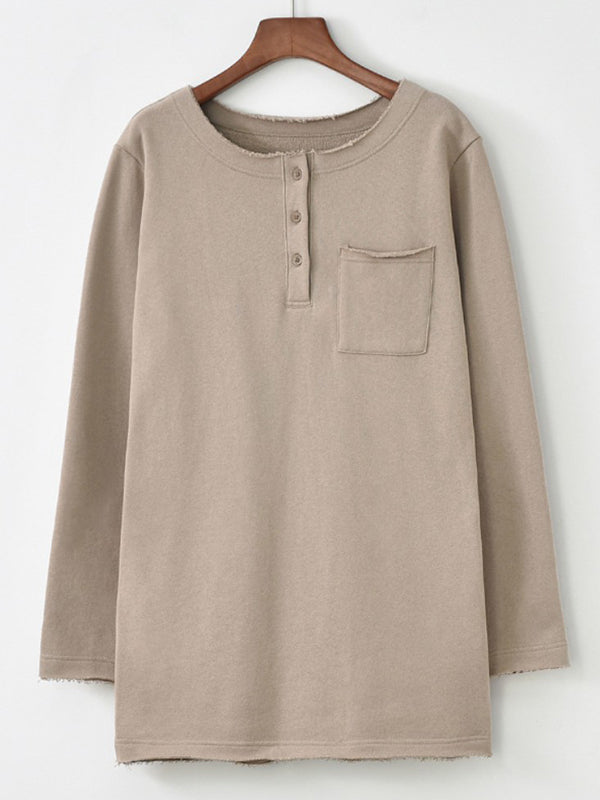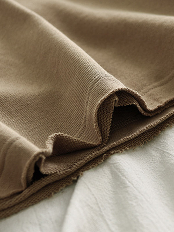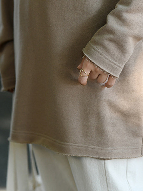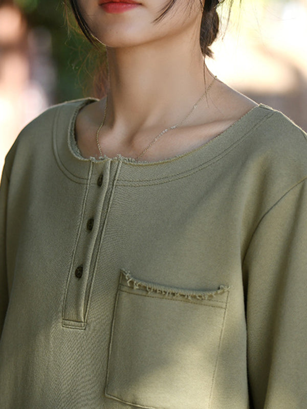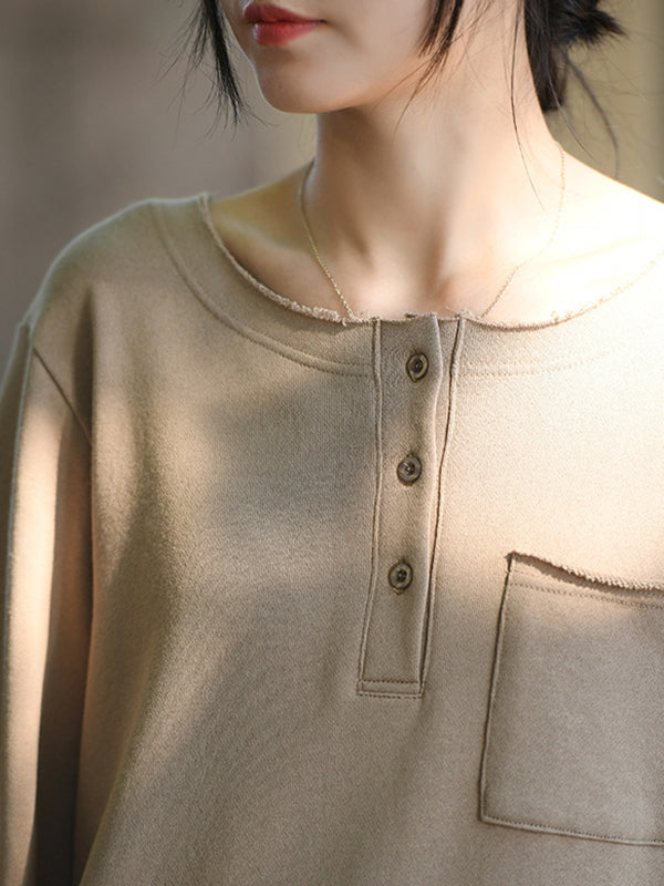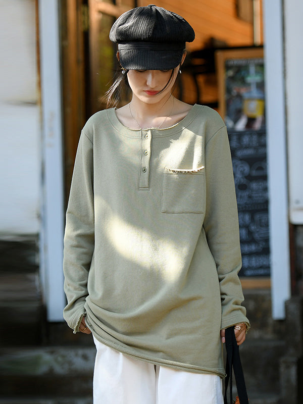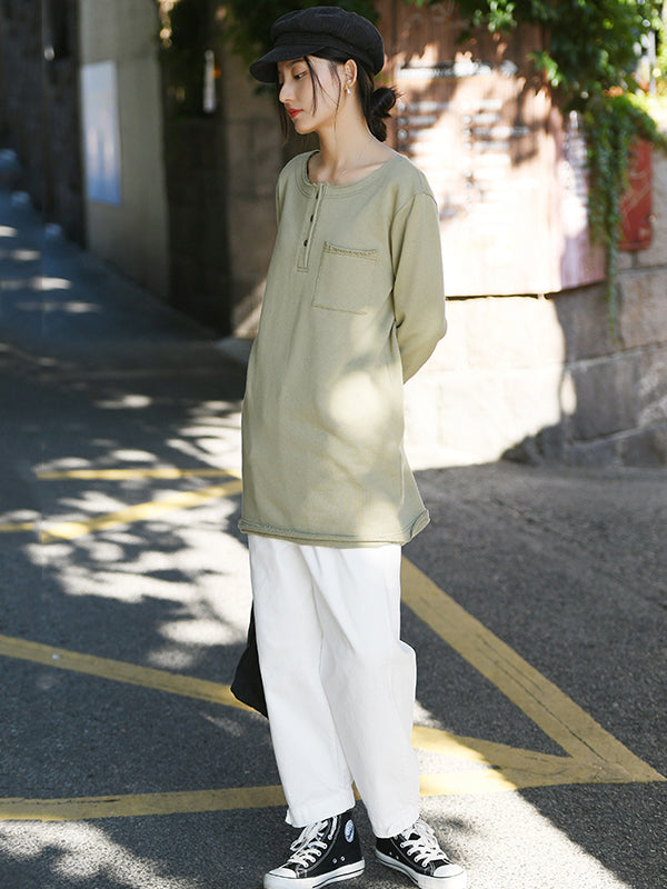 Artistic Retro Long Sleeves Loose Solid Color Round-Neck T-Shirts Tops