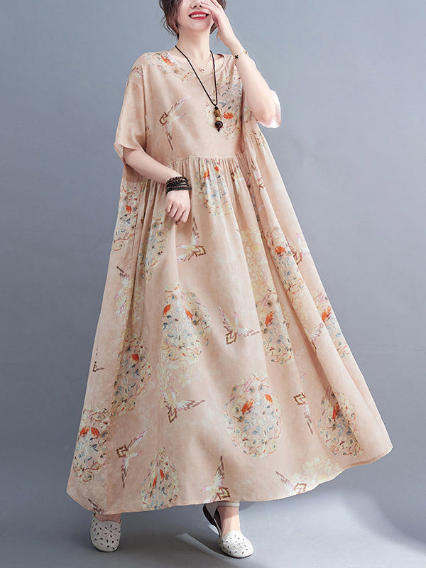Artistic Retro Loose Floral Printed Pleated Half Sleeves Midi Dress