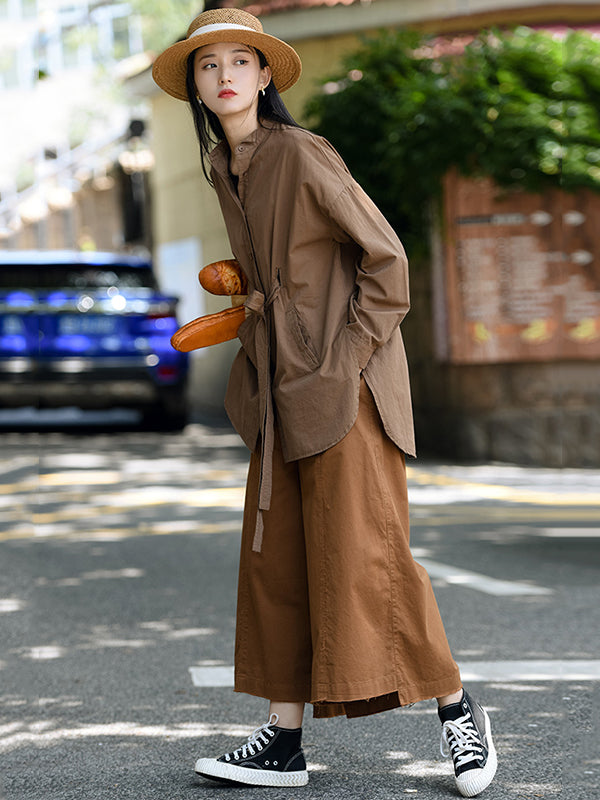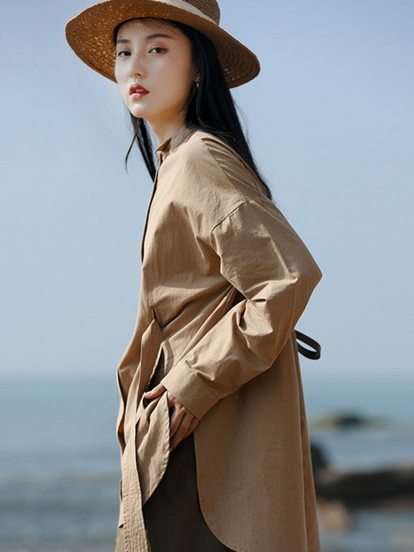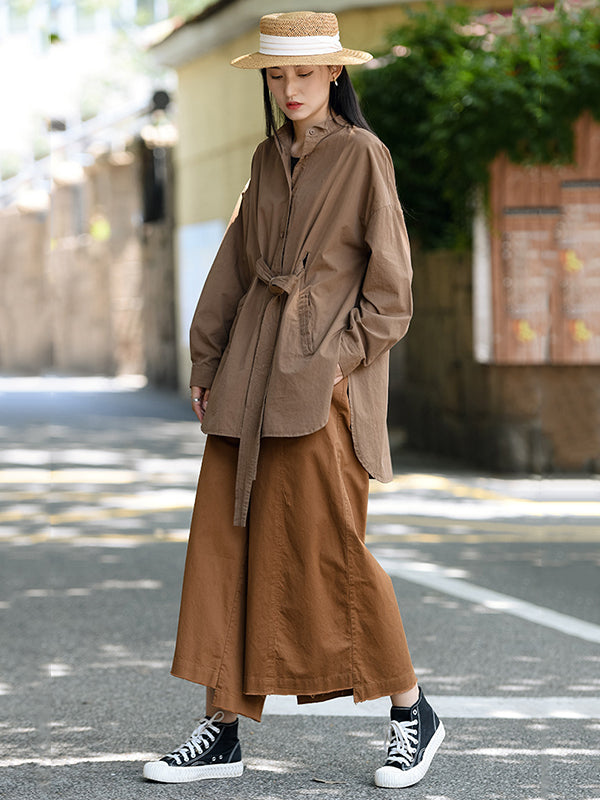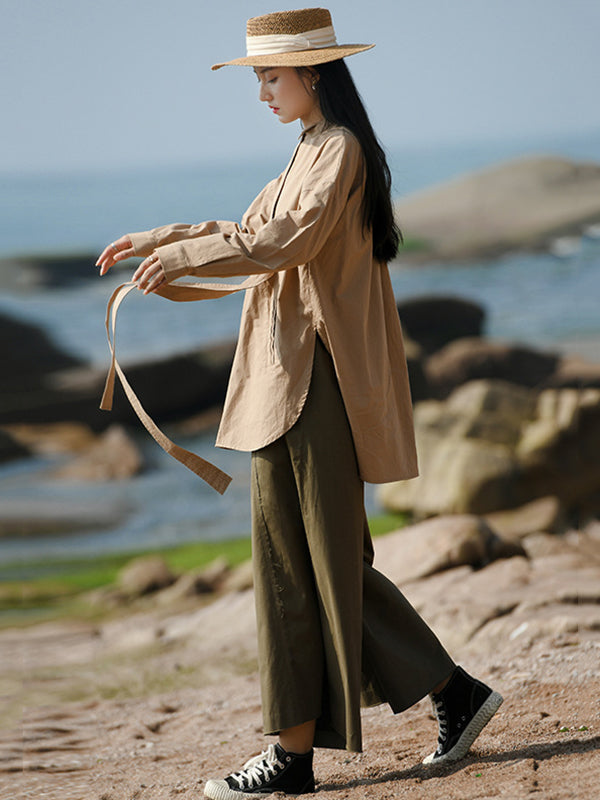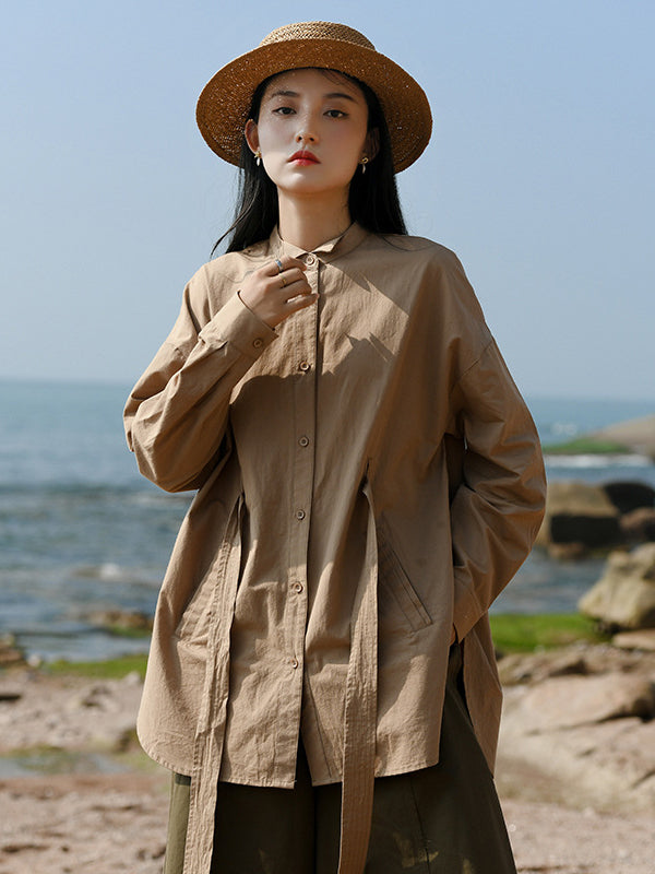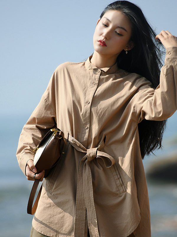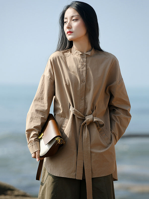 Artistic Retro Loose Long Sleeves Buttoned Tied Solid Color Stand Collar Blouses&Shirts Tops