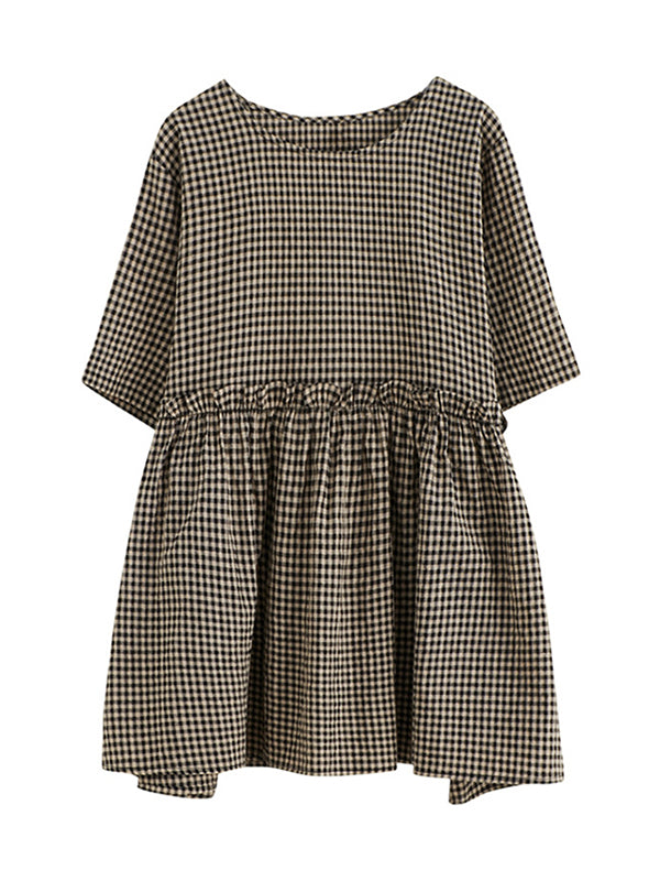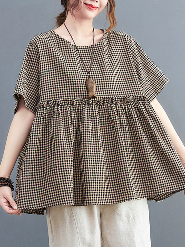 Artistic Retro Loose Plaid Ramie Cotton Falbala T-Shirt Top