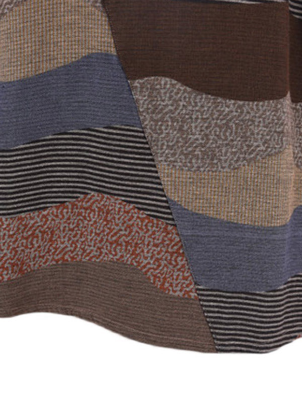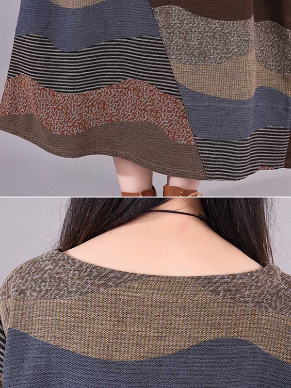 Artistic Retro Loose Ramie Cotton Striped Multi-Colored Round-Neck Long Sleeves Midi Dress