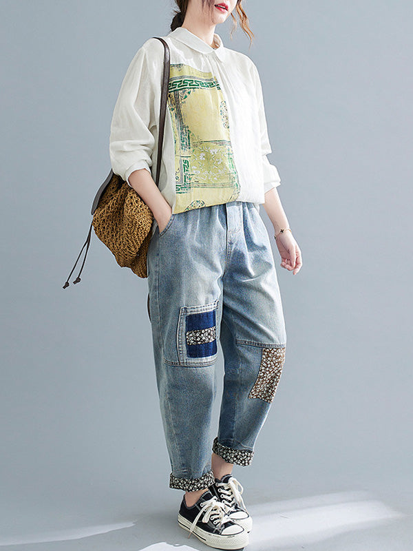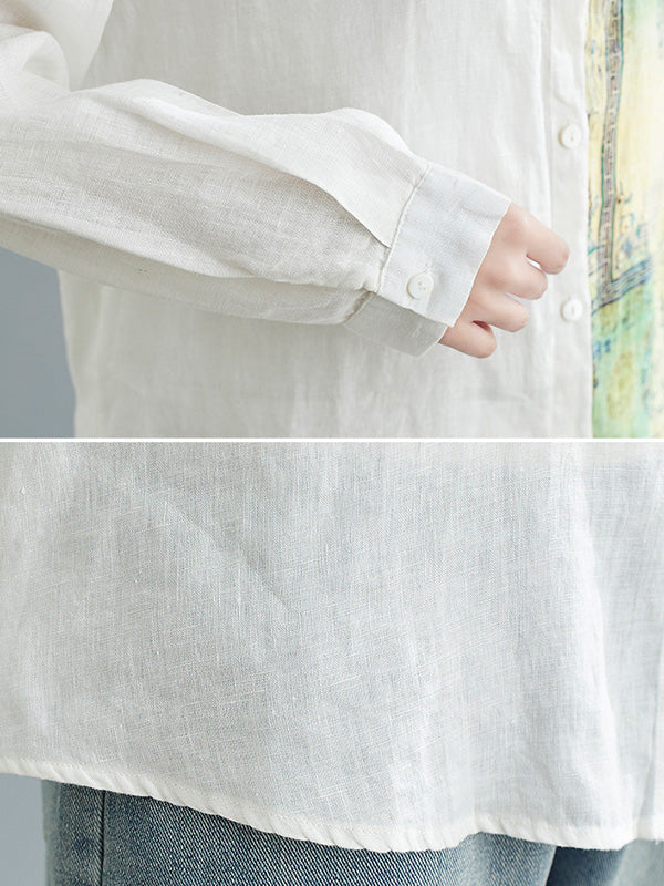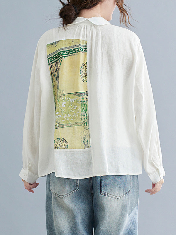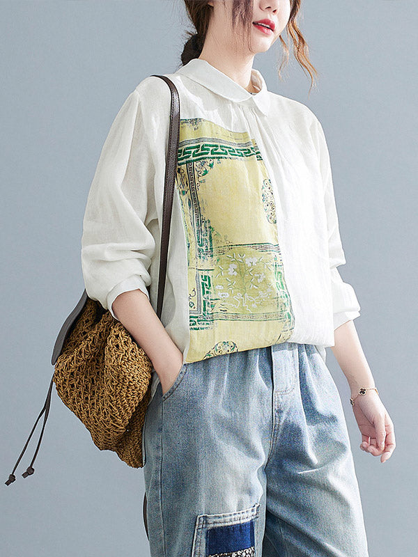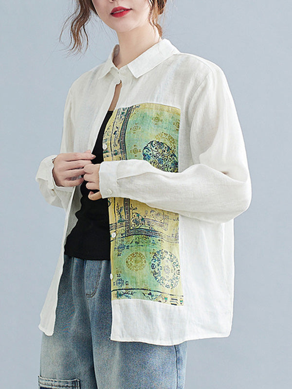 Artistic Retro National Printed Split-Joint Pleated Lapel Collar Long Sleeves Blouse