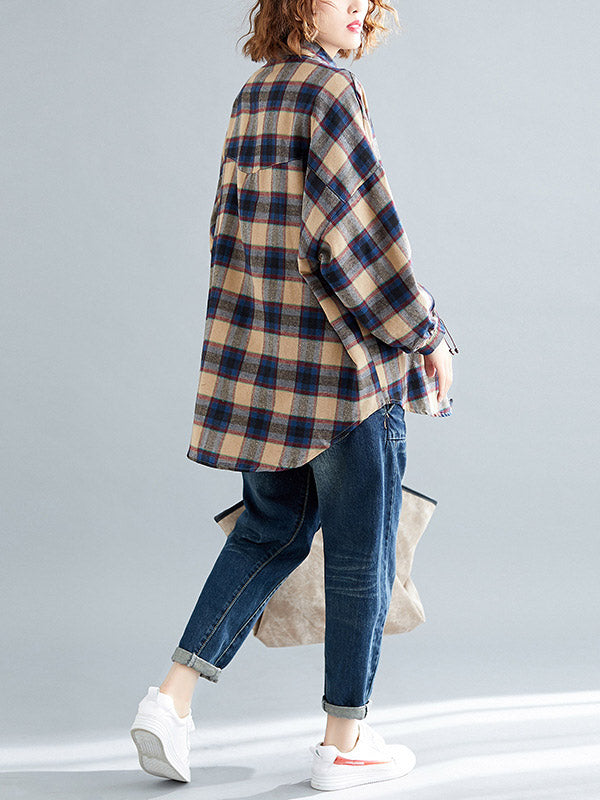 Artistic Retro Plaid Buttoned Lapel Collar Long Sleeves Blouse