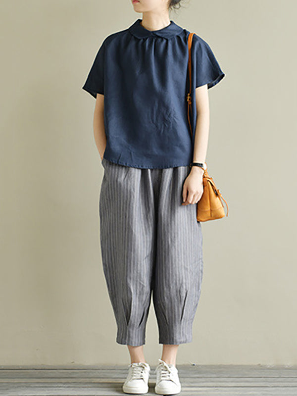 Artistic Retro Short Sleeves Loose Pleated Solid Color Blouses&Shirts Tops