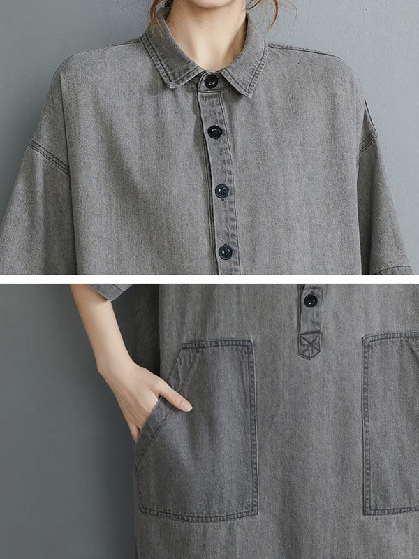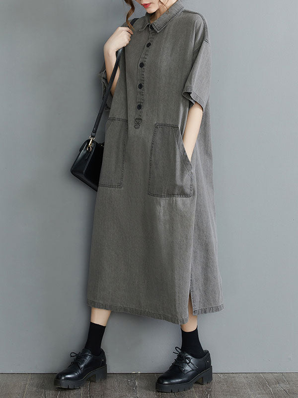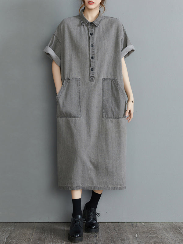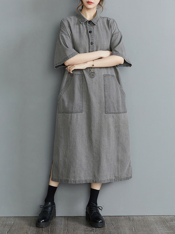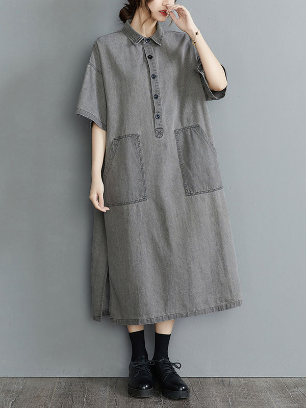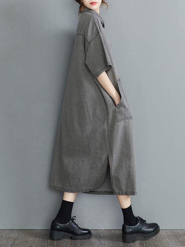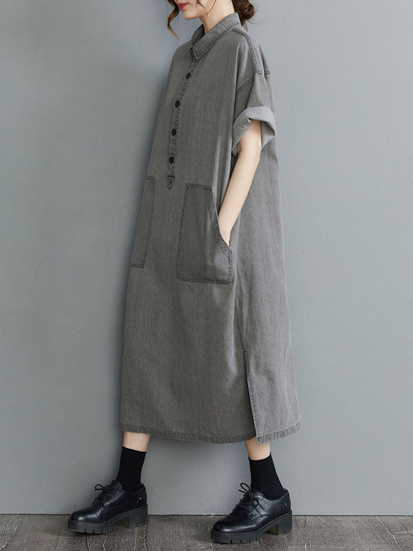 Artistic Retro Split-Joint Lapel Short Sleeves Loose Shirt Dress
