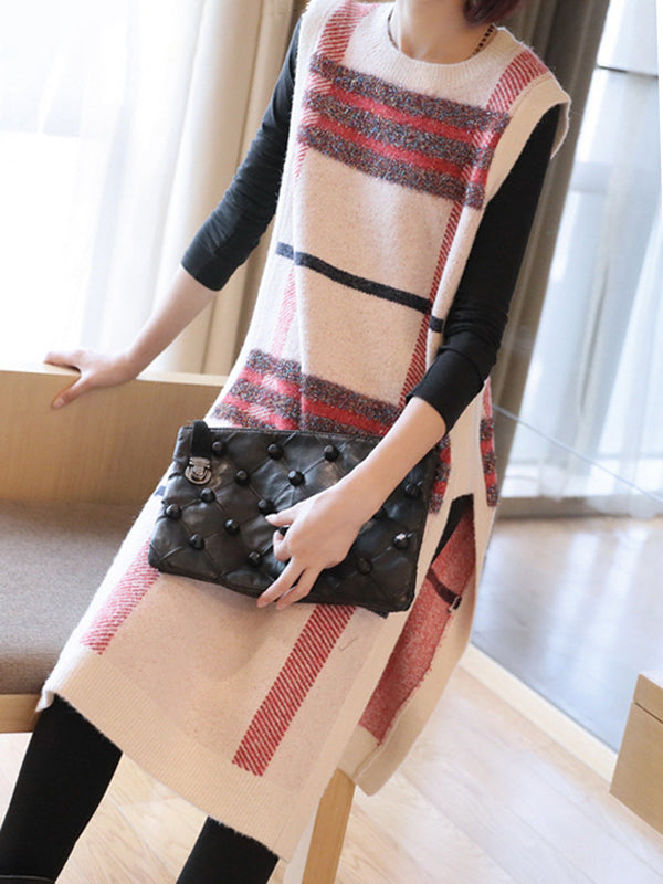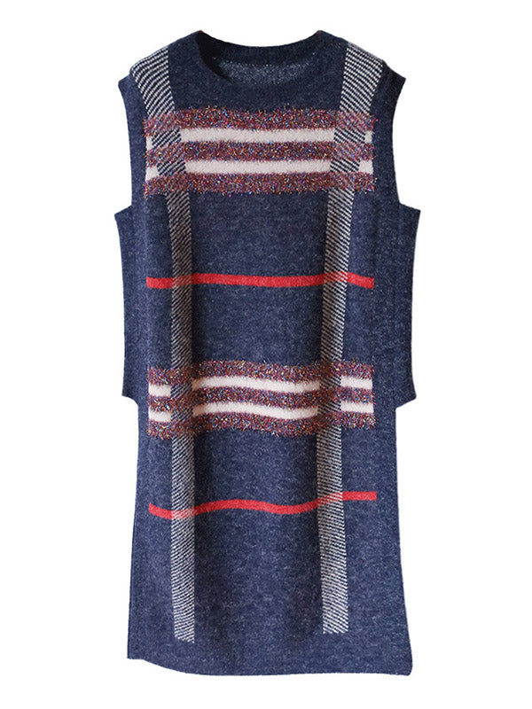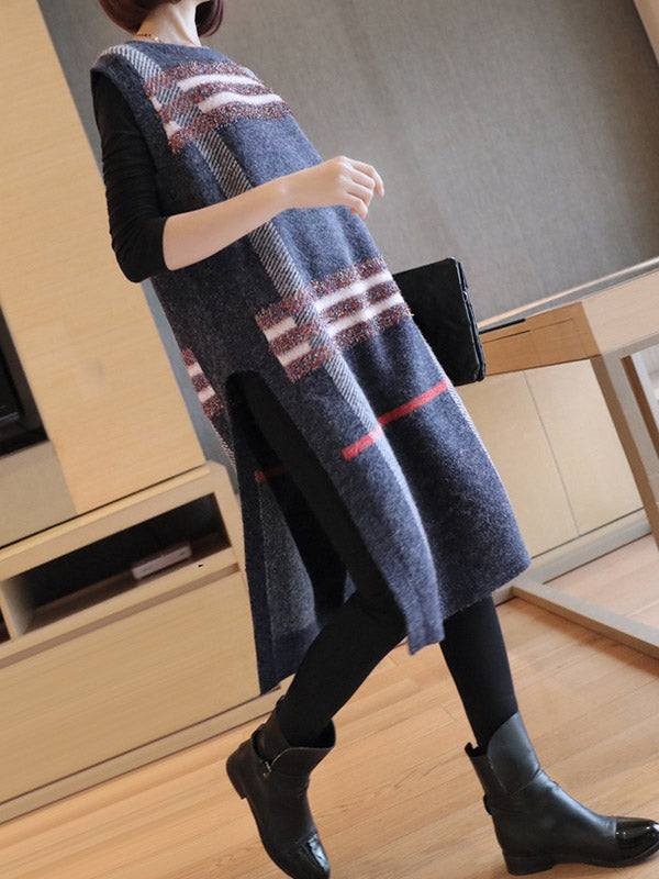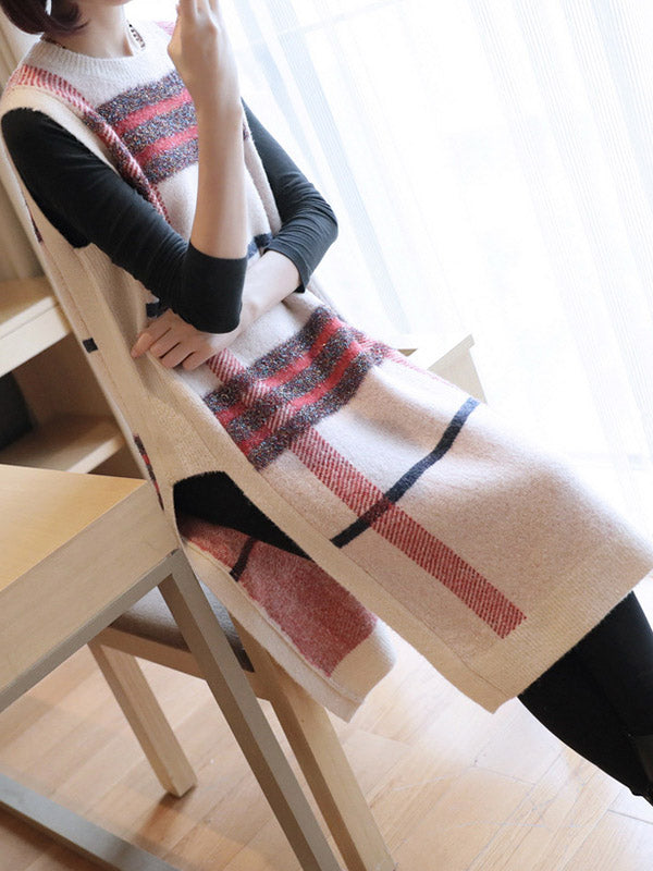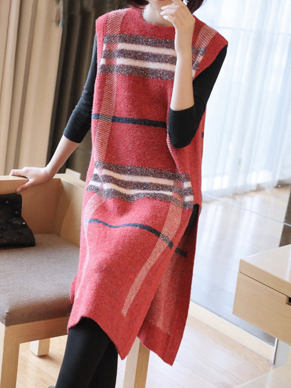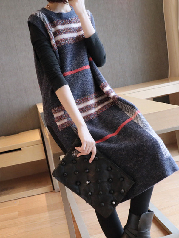 Artistic Retro Striped Split-Side Round-Neck Sleeveless Knitted Vest