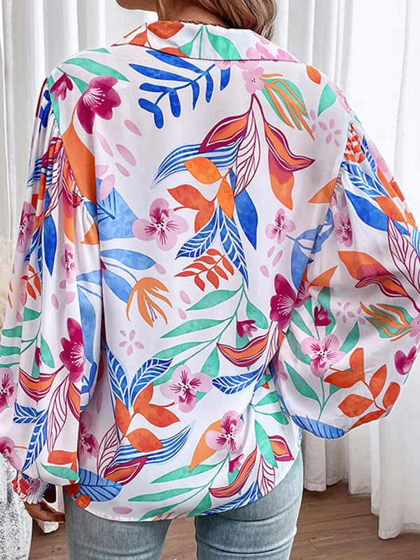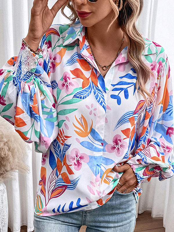 Batwing Sleeves Long Sleeves Elasticity Flower Print Leaves Print Pleated Lapel Blouses&Shirts Tops