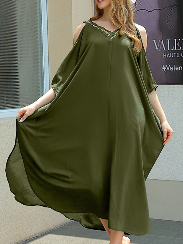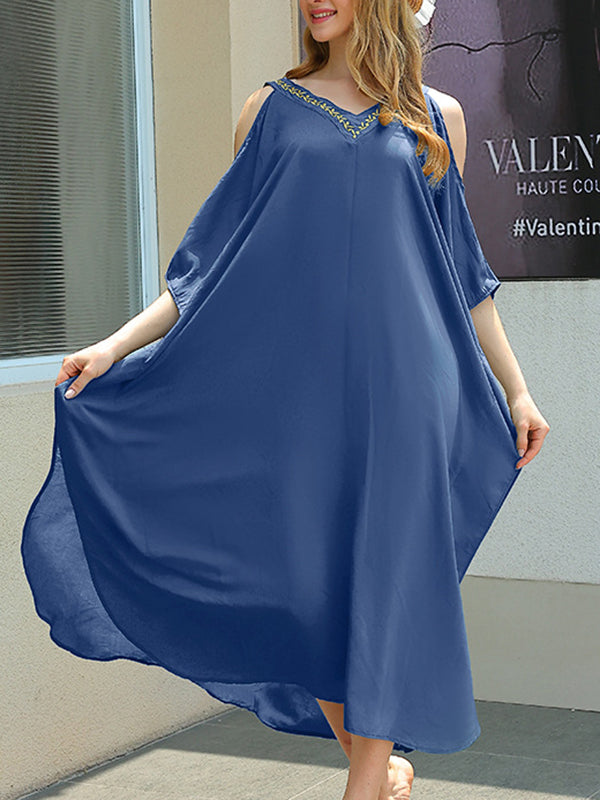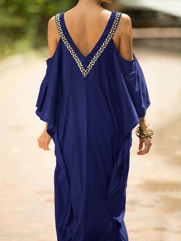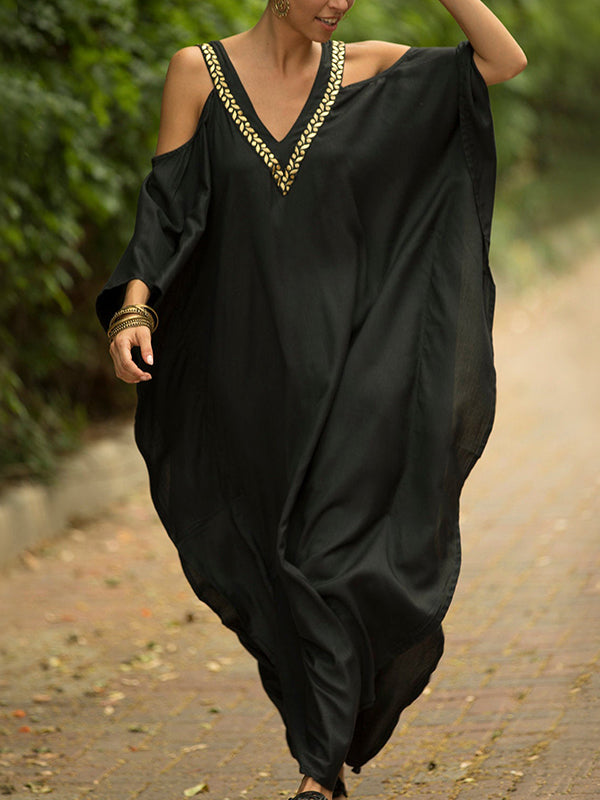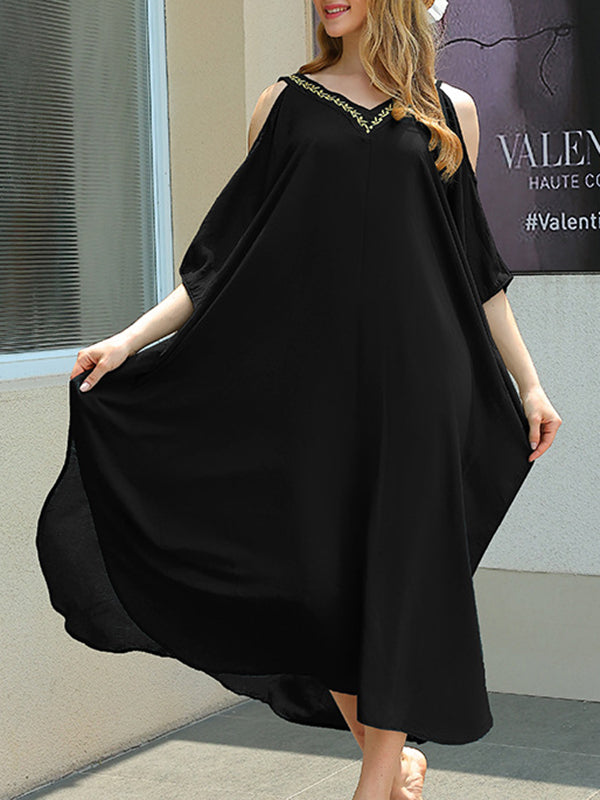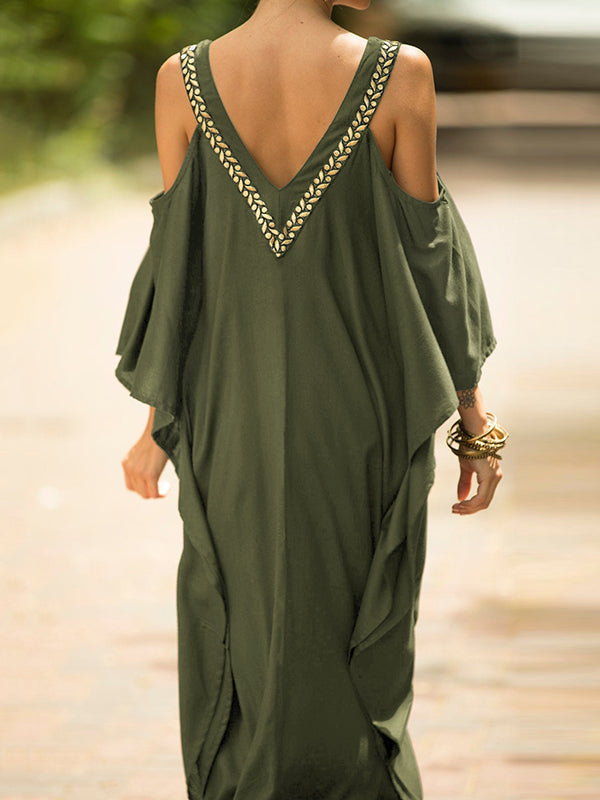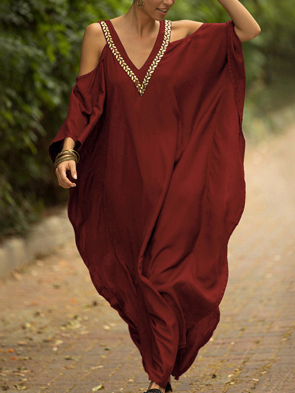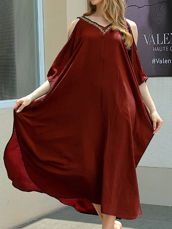 Batwing Sleeves Loose Contrast Color Embroidered V-Back Cold Shoulder Midi Dresses