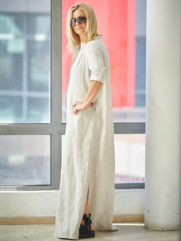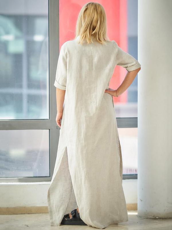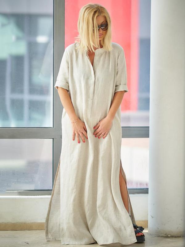 Beige 3/4 Sleeves Split-side With-pockets Linen Dress
