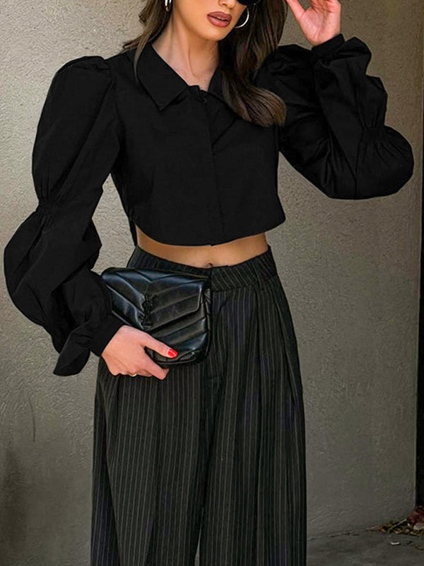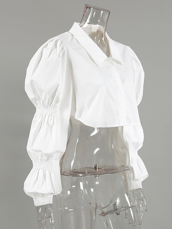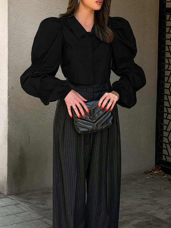 Bishop Sleeve Long Sleeves Buttoned Elasticity Solid Color Lapel Blouses&Shirts Tops