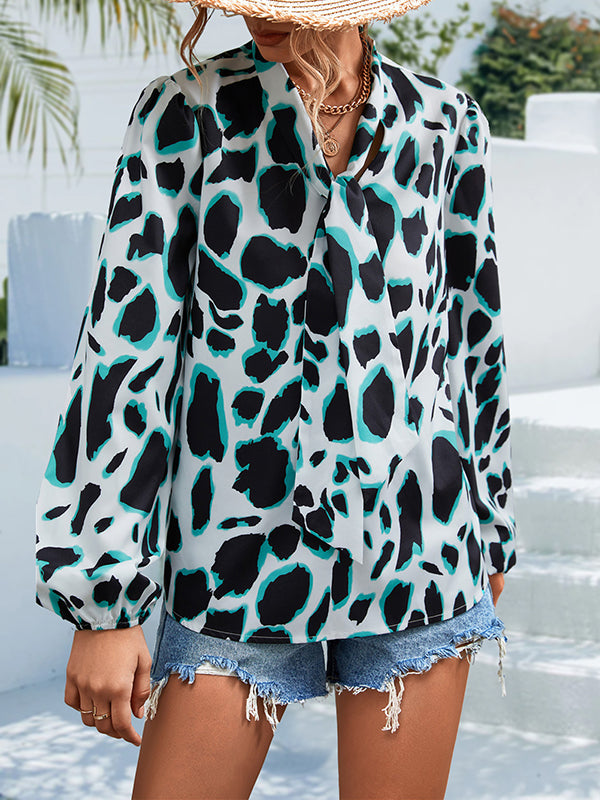 Bishop Sleeve Long Sleeves Elasticity Leopard Tied V-Neck Blouses&Shirts Tops