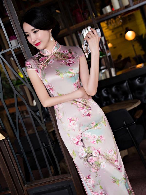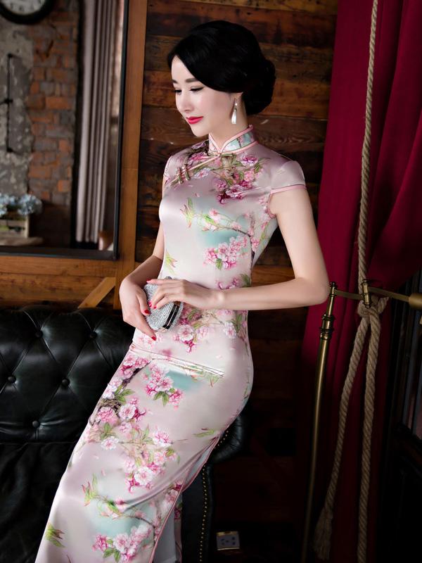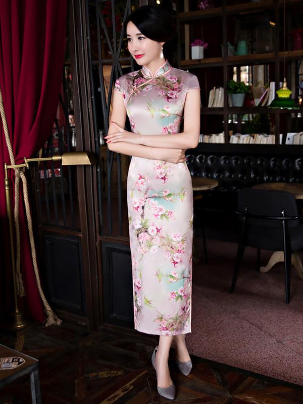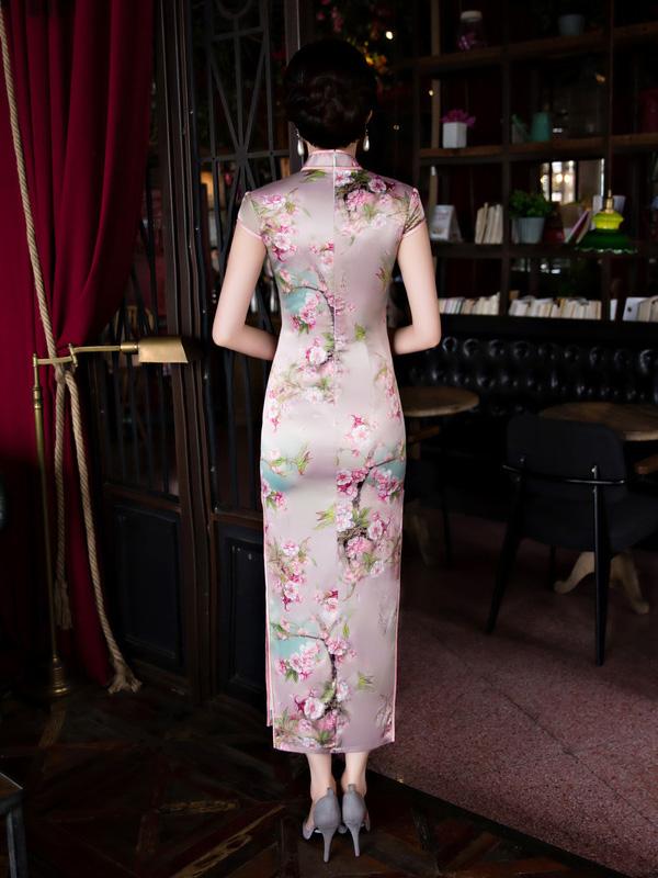 Blossom Stand Collar Long Cheongsam Dress
