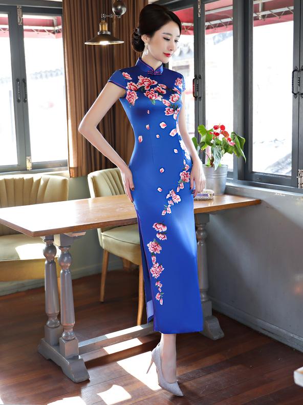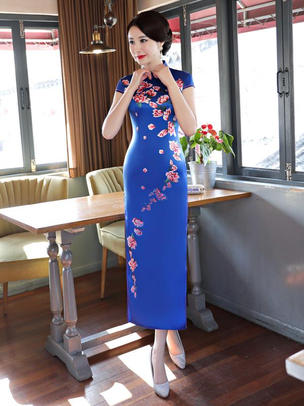 Blue Flower Print Stand-collar Long Cheongsam