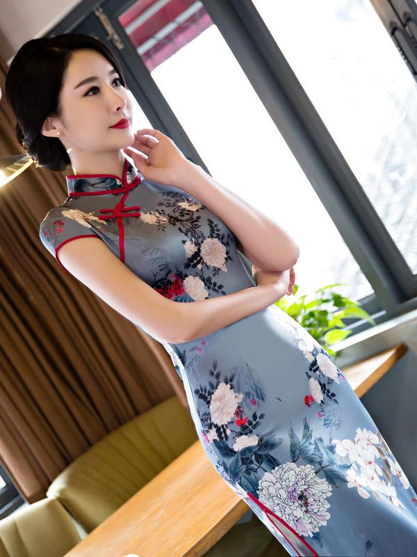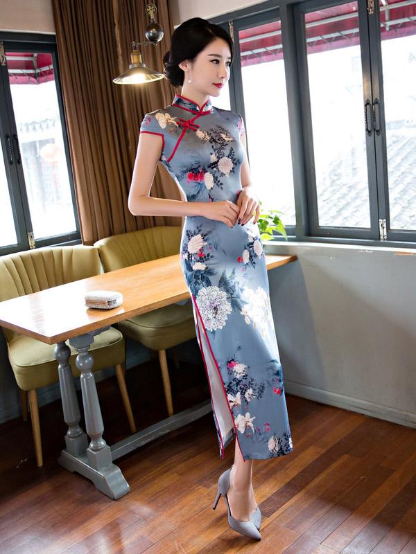 Blue-gray Peony Print Stand-collar Long Cheongsam