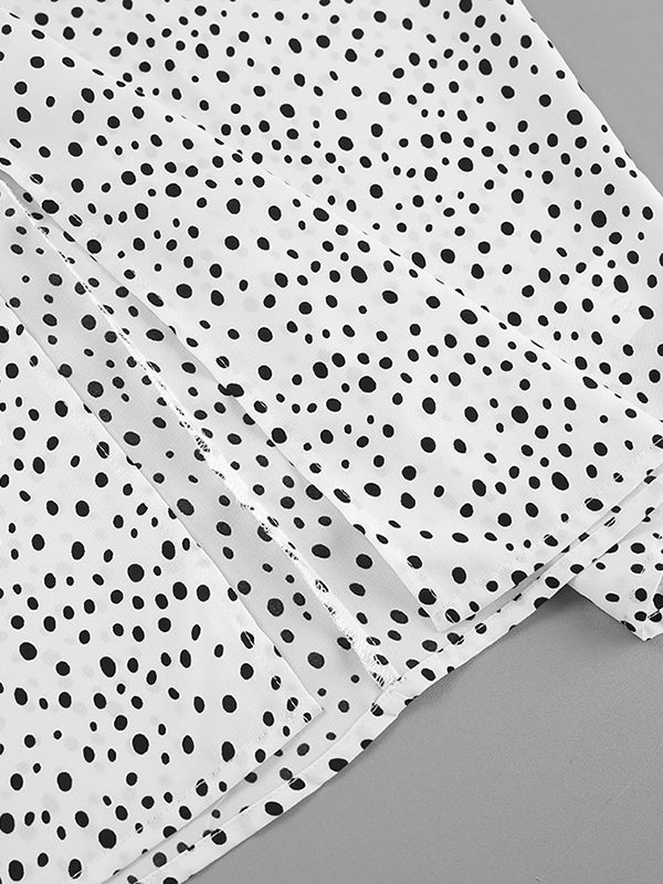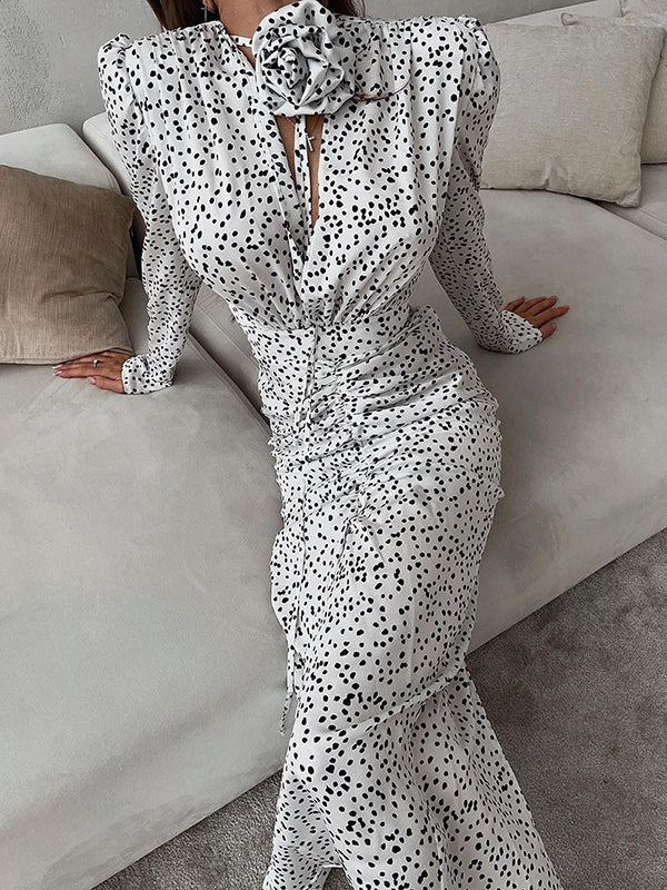 Bodycon High Waisted Pleated Polka-Dot Split-Back Three-Dimensional Flower V-Neck Maxi Dresses