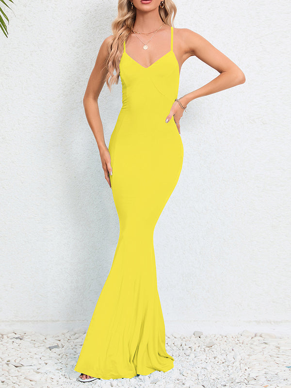 Bodycon Mermaid Solid Color Split-Joint Spaghetti-Neck Maxi Dresses
