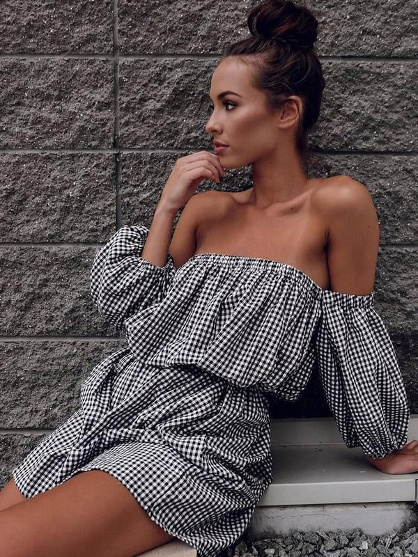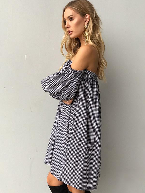 Bohemia Plaid Off Shoulder Long Sleeves Mini Dress