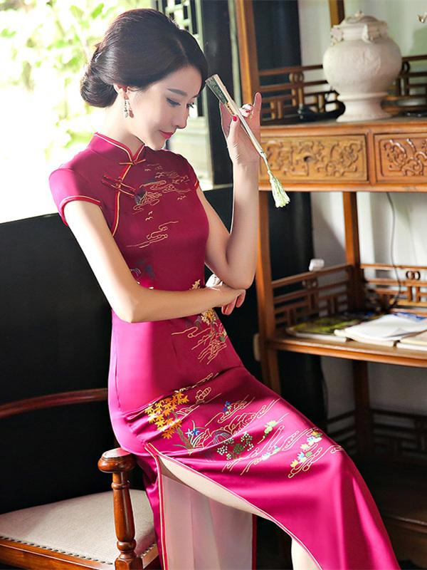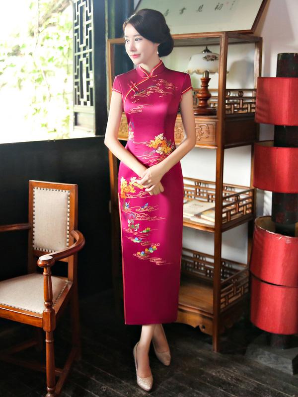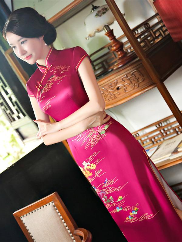 Burgundy Printed Stand-collar Long Cheongsam