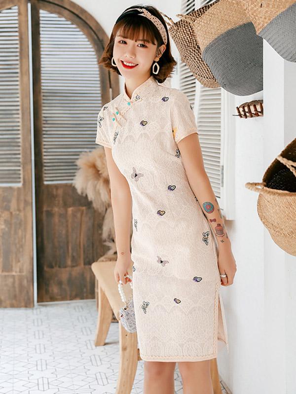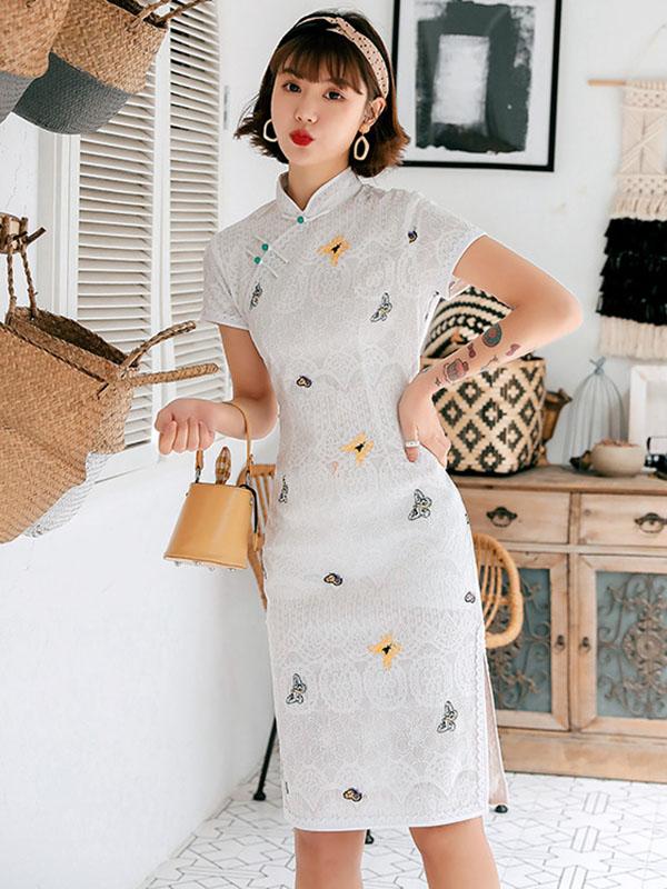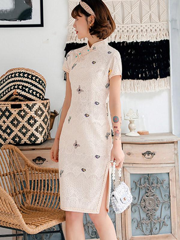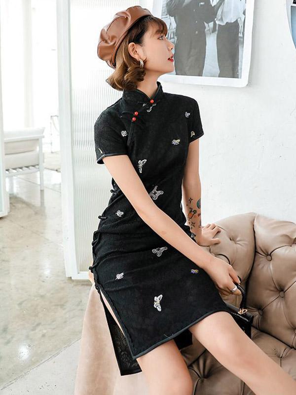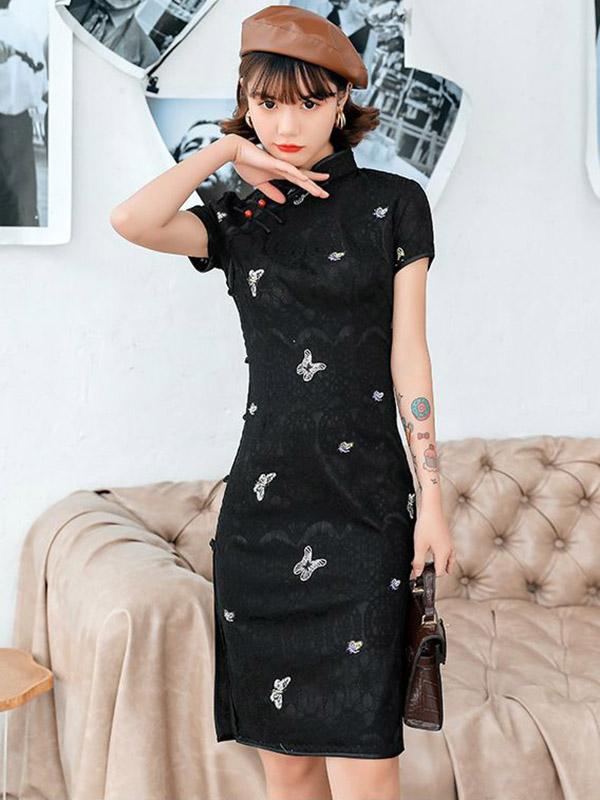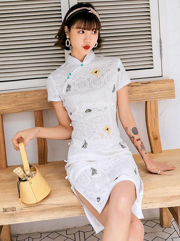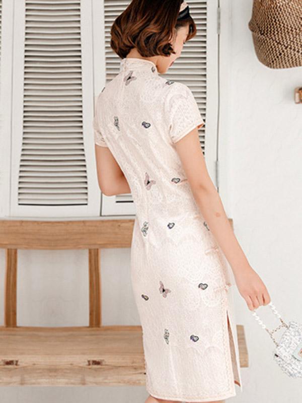 Butterflies Print Lace Stand Collar Short Cheongsam