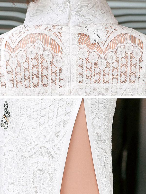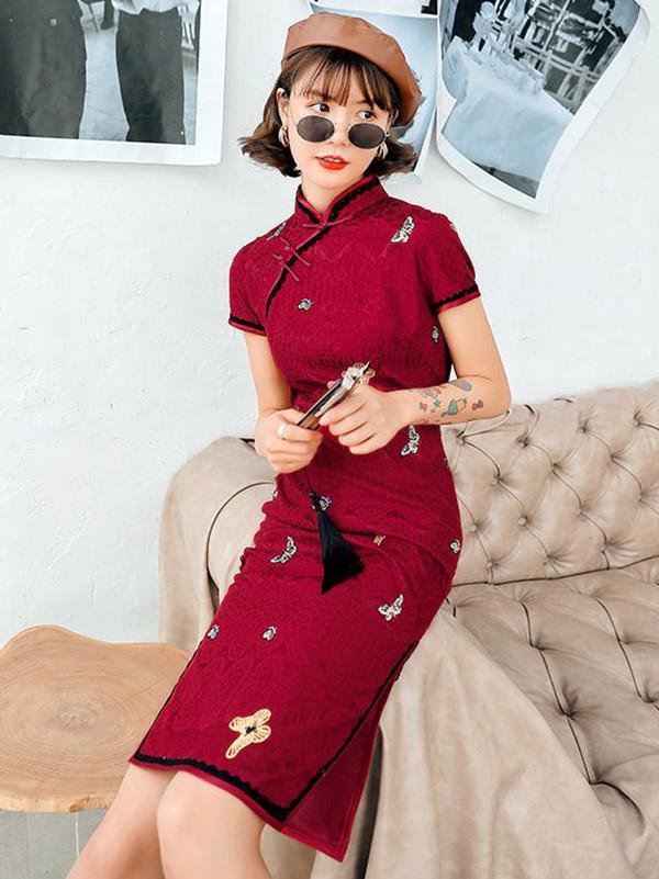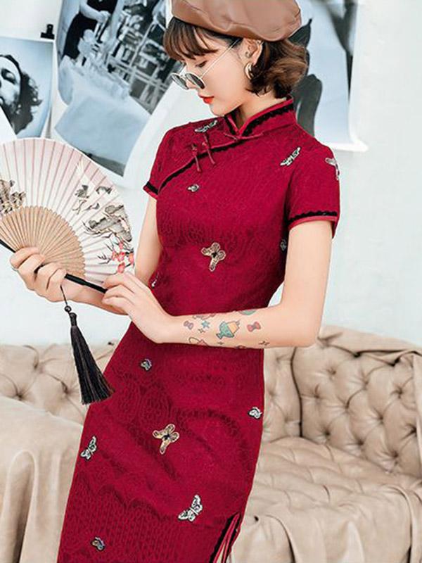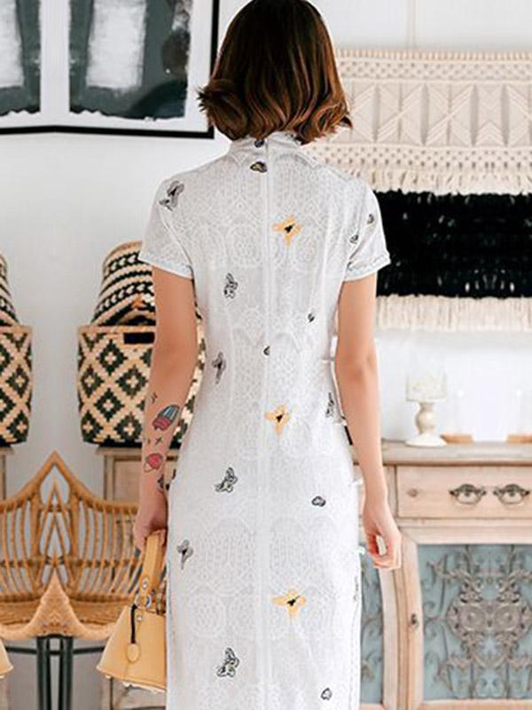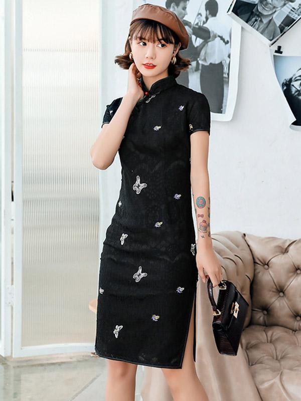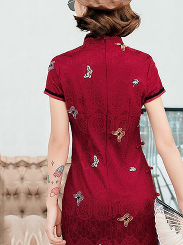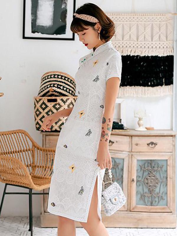 Butterflies Print Lace Stand Collar Short Cheongsam