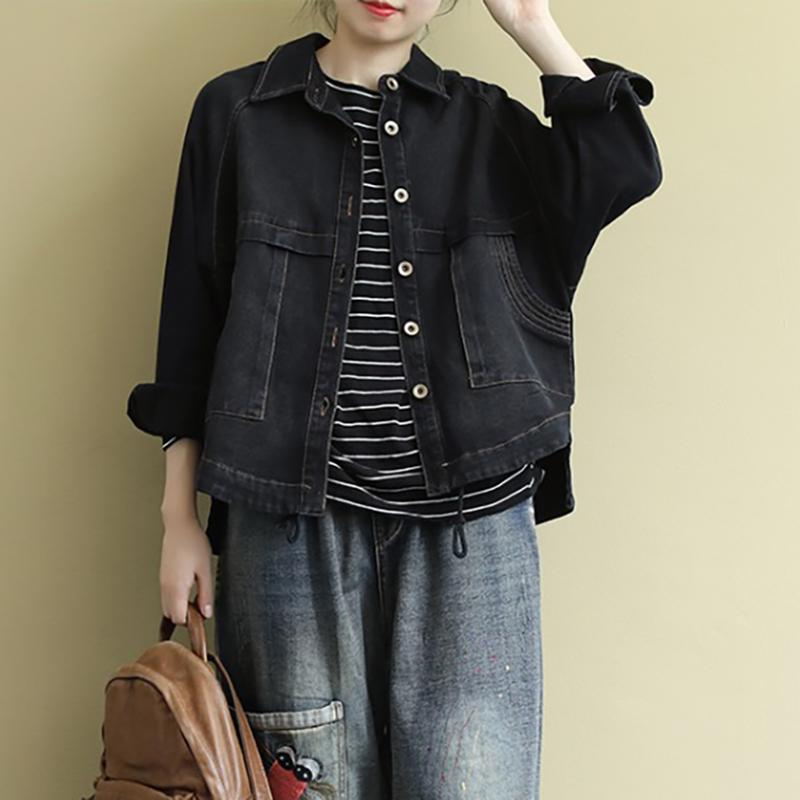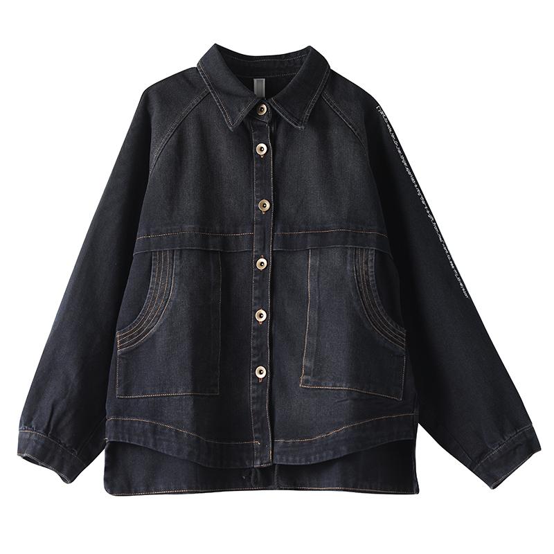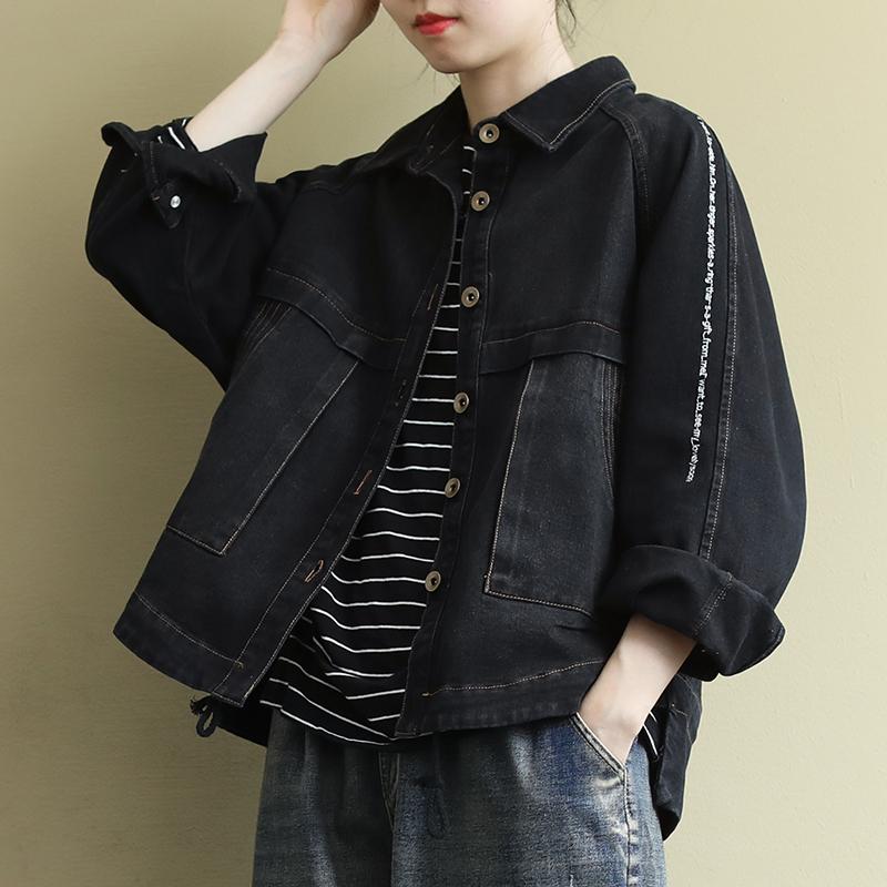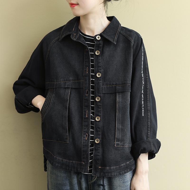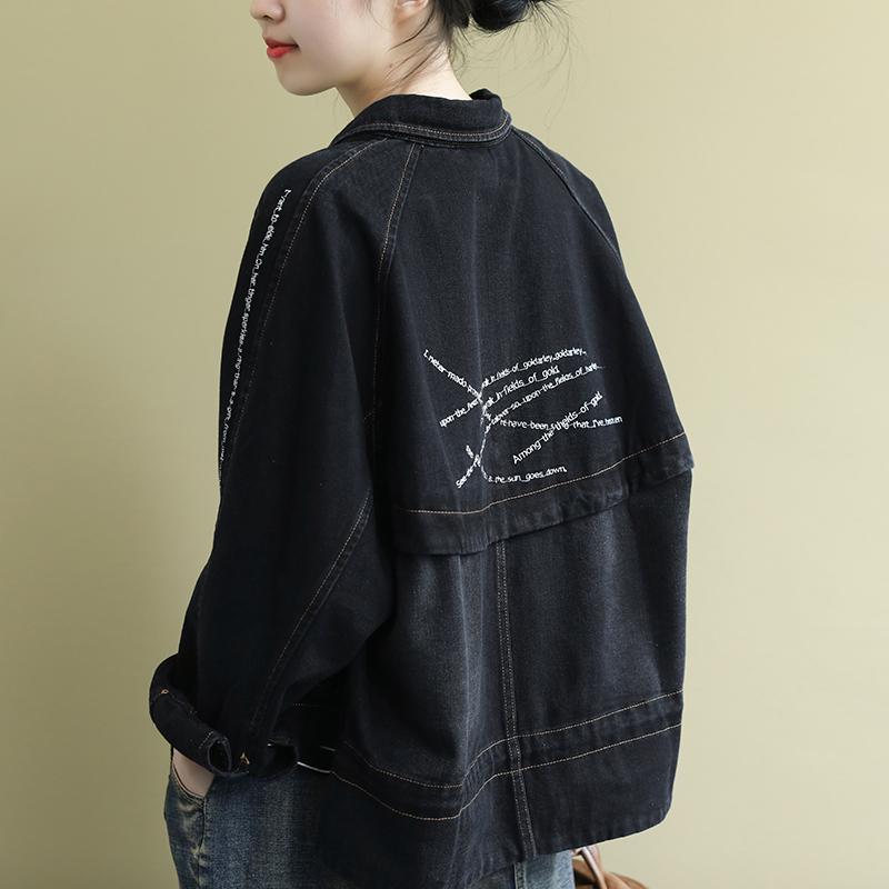 Buykud Casual Turn-down Collar Embroidered Letters Denim Coat